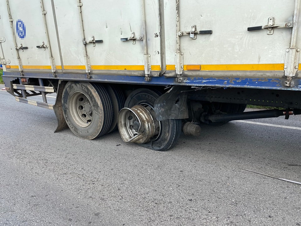 และห่างออกไปรถบรรทุก 10 ล้อ ฮีโน่ สีขาว ป้ายทะเบียน ขอนแก่น สภาพด้านข้างรถฝั่งมีร่องรอยการชนได้รับความเสียหาย และยางล้อรถฝั่งขวาสภาพฉีดขาด