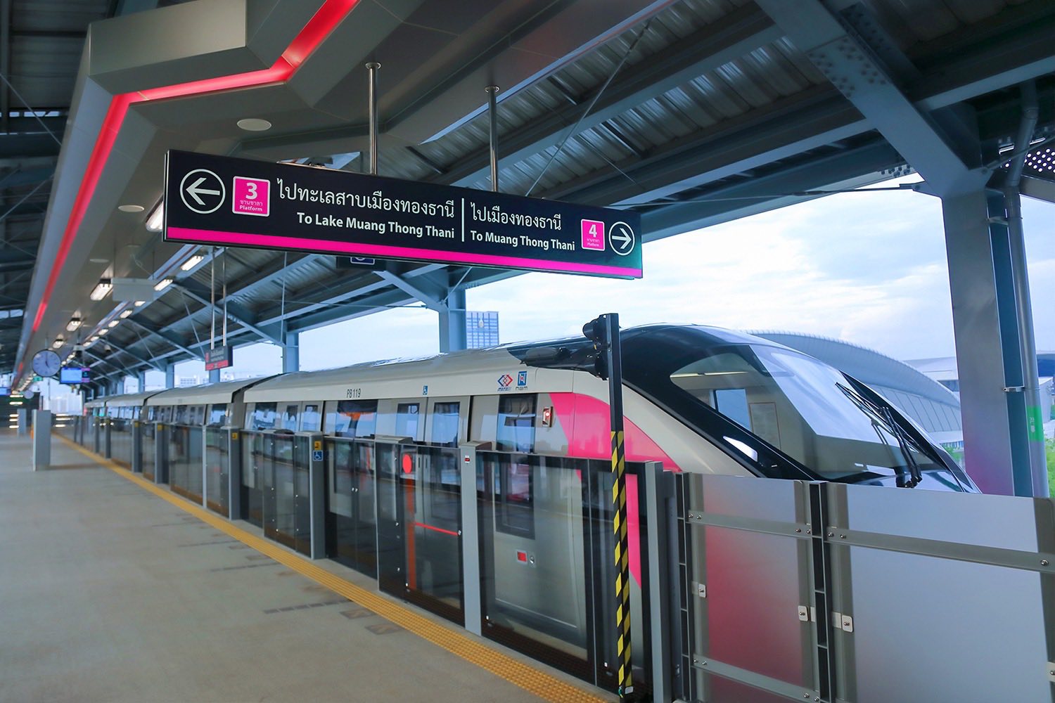ผู้ใช้บริการรถไฟฟ้าสายสีชมพูส่วนต่อขยาย สามารถลงที่สถานีอิมแพ็ค เมืองทองธานี (MT01) ทางออก 3 เพื่อเดินเชื่อมเข้าสู่อาคาร ชาเลนเจอร์ ฮอลล์ 1 ผ่านทาง Skywalk หรือเลือกลงที่สถานีทะเลสาบเมืองทองธานี (MT02) ทางออก 4 ซึ่งมี Skywalk เชื่อมเข้าสู่อาคาร อิมแพ็ค เอ็กซิบิชั่น เซ็นเตอร์ ฮอลล์ 12 ได้โดยตรง