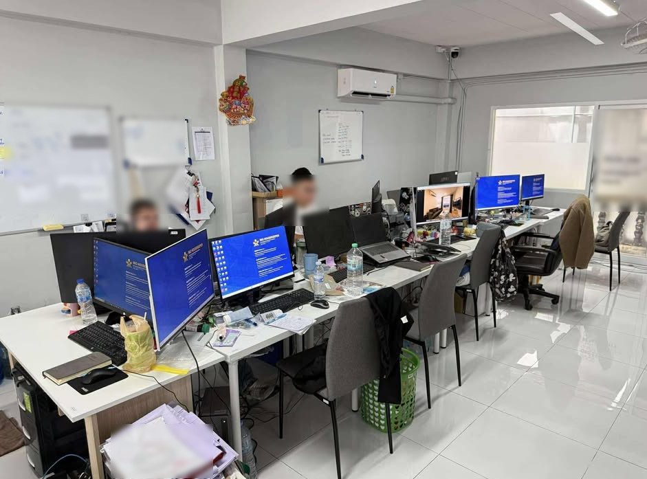จากการตรวจสอบพบว่าบริษัทดังกล่าว เปิดเป็นสำนักงานซื้อขายบ้านพักที่ดินขนาดใหญ่ ในอาคารพาณิชย์รวม 4 คูหา มีด้วยกันทัังหมด 3 ชั้น ตำรวจจึงอ่านหมายค้นให้ นายคำ (นามสมมุติ) CEO ประธานกรรมบริษัท รับทราบถึงวัตถุประสงค์ จากการกระจายกำลังตรวจโดยตรวจชั้น 1-2 ทำเป็นที่บริการรับรองลูกค้า ส่วนชั้นที่ 3-4 เปิดเป็นออฟฟิศมีด้วยกันหลายแผนก ประกอบด้วยแอดมินฝ่ายบริการด้านทำความสะอาดและซ่อมแซม แอดมินฝ่ายเจาะทรัพย์ ผู้ช่วยเซลส์ และการตลาด โดยมีพนักงานคนไทย-ต่างชาติ จำนวนมาก กำลังนั่งทำงานอยู่หน้าคอมพิวเตอร์ ขณะที่บางส่วนก็กำลังพูดคุยบริการลูกค้า