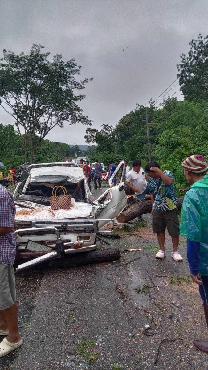 โดยหลังได้รับแจ้งจากชาวบ้านว่ามีเหตุต้นไม้ล้มทับรถยนต์ จึงออตรวจสอบพร้อม พร้อมด้วยกู้ชีพ อบต โชคชัย ที่เกิดเหตุพบต้นไม้ขนาดใหญ่ล้มทับรถกระบะยี่ห้อโตโยต้า สีขาว ทะเบียน มุกดาหาร สภาพห้องโดยสารยุบ ในรถพบผู้เสียชีวิตเป็นคนขับ เป็นชายอายุ 54 ปี ส่วนหญิงที่นั่งข้างเป็นภรรยา อายุ 49 ปี ก็เสียชีวิตเช่นกัน โดย สภาพศีรษะถูกทับ ส่วนลูกสาวอยู่ในแคปด้านหลังคนขับบาดเจ็บไม่มาก
