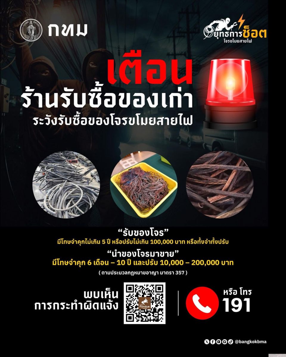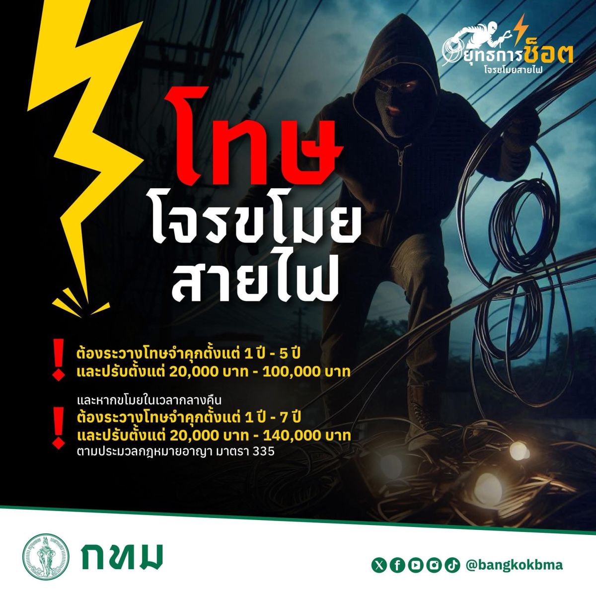 นอกจากนี้ กทม. ได้เปิด “ยุทธการช็อตโจรขโมยสายไฟ” พร้อมระดมความร่วมมือจากทุกภาคส่วน ทั้งการใช้เทคโนโลยี การบังคับใช้กฎหมายอย่างเข้มข้น และการมีส่วนร่วมของประชาชน เพื่อป้องกันและลดความเสียหายจากปัญหาการขโมยสายไฟในพื้นที่กรุงเทพฯ ที่ไม่เพียงสร้างความเสียหายต่อทรัพย์สินของรัฐเป็นมูลค่าหลายล้านบาท แต่ยังส่งผลกระทบโดยตรงต่อความเป็นอยู่ของประชาชน