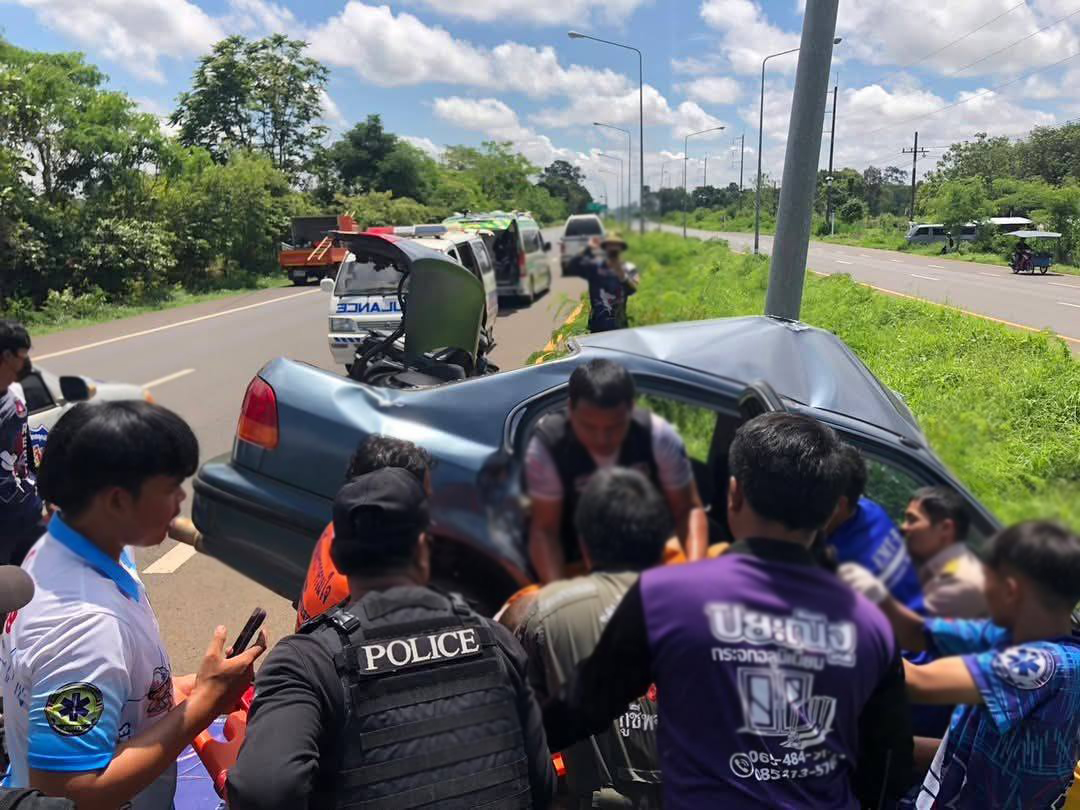 จ.ศรีสะเกษ รถนั่งส่วนบุคคลเสียหลักฟาดเสาไฟ ริมถนนหมายเลข 24 มีผู้บาดเจ็บสาหัสเป็นพระภิกษุ ก่อนไปมรณภาพที่ รพ.