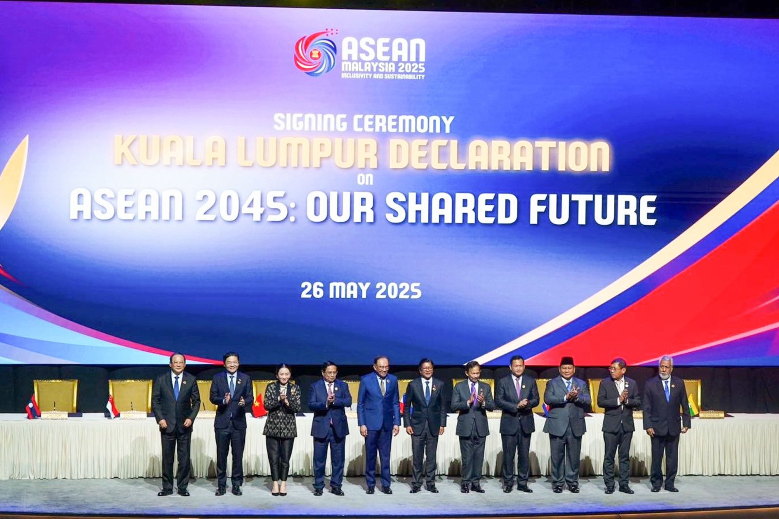 จากนั้น นายกรัฐมนตรีมาเลเซียในฐานะประธานอาเซียน ปี 2568 มอบปฏิญญากัวลาลัมเปอร์ว่าด้วยอาเซียน 2045: อนาคตร่วมกันของเรา ที่ลงนามแล้วให้แก่เลขาธิการอาเซียน และถ่ายภาพการจับมือแบบวิถีอาเซียน (ASEAN Way) ร่วมกัน