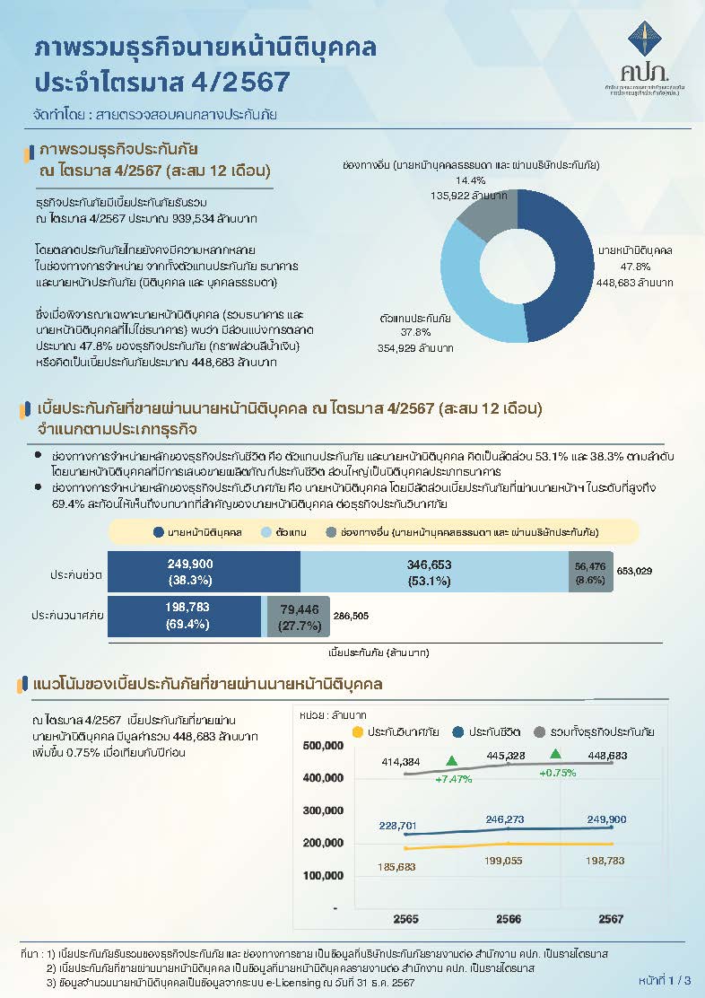 สำนักงานคณะกรรมการกำกับและส่งเสริมการประกอบธุรกิจประกันภัย (สำนักงาน คปภ.) โดยสายตรวจสอบคนกลางประกันภัยเปิดเผยข้อมูลว่า ในปี 2567 เบี้ยประกันภัยที่เสนอขายผ่านนายหน้านิติบุคคลมีมูลค่ารวมกว่า 448,683 ล้านบาท เพิ่มขึ้น ร้อยละ0.75 จากปีก่อนหน้า คิดเป็นส่วนแบ่งการตลาดประมาณ ร้อยละ 47.8 ของเบี้ยประกันภัยรวม แบ่งเป็นเบี้ยประกันชีวิต 249,900ล้านบาท และเบี้ยประกันวินาศภัย 198,783 ล้านบาท สะท้อนบทบาทสำคัญของนายหน้านิติบุคคลในฐานะคนกลางประกันภัยที่ช่วยให้ประชาชนสามารถเข้าถึงผลิตภัณฑ์ประกันภัยได้มากขึ้น โดยผลิตภัณฑ์ประกันชีวิตที่ขายผ่านนายหน้านิติบุคคล ส่วนใหญ่เป็นประกันชีวิตประเภทสามัญ คิดเป็นสัดส่วน ร้อยละ76 ของเบี้ยประกันชีวิตรวม มีอัตราเติบโต ร้อยละ 4.01 เมื่อเทียบกับปีก่อนหน้าเนื่องจากความหลากหลายของผลิตภัณฑ์ที่สามารถตอบสนองต่อความต้องการของลูกค้า ประกอบกับศักยภาพด้านการตลาดและการเข้าถึงลูกค้าของนายหน้านิติบุคคล ขณะที่ประกันชีวิตกลุ่ม มีสัดส่วนประมาณ ร้อยละ 24 และมีแนวโน้มปรับตัวลดลงร้อยละ5.86 อันเป็นผลจากภาวะชะลอตัวทางเศรษฐกิจ ด้านประกันวินาศภัย ประกันภัยรถยนต์ ยังคงเป็นผลิตภัณฑ์หลักที่นายหน้านิติบุคคลเสนอขาย คิดเป็นสัดส่วน ร้อยละ 57 ของเบี้ยประกันวินาศภัยรวม โดยมีการปรับตัวลดลง ร้อยละ 1.71เมื่อเทียบกับปีก่อน ซึ่งสอดคล้องกับภาวะชะลอตัวของอุตสาหกรรมยานยนต์โดยรวม