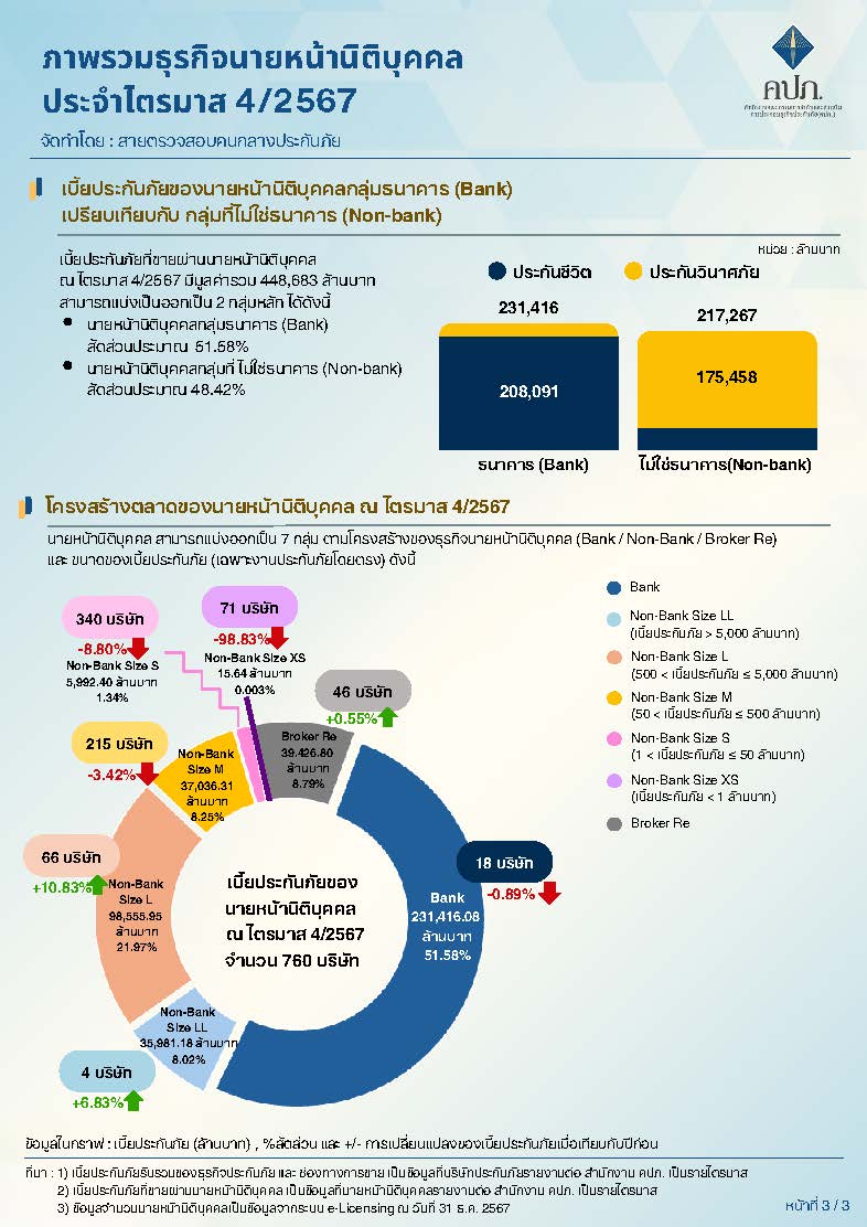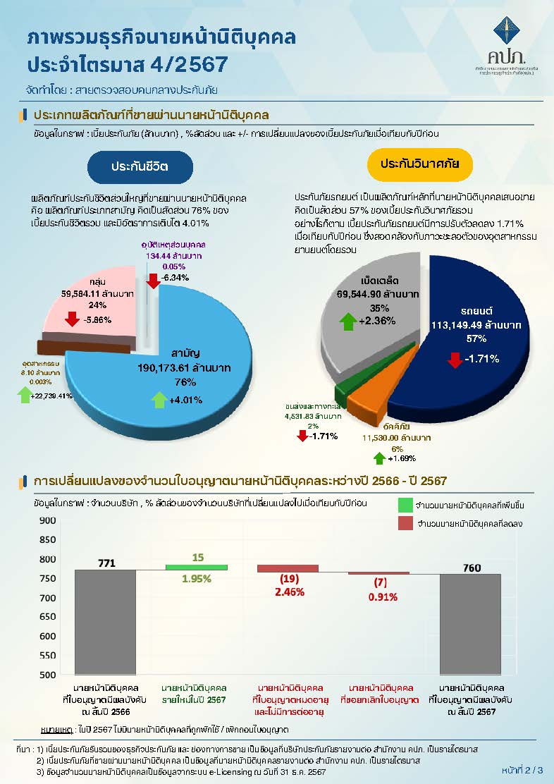 สำหรับข้อมูล ณ สิ้นปี 2567 มีนายหน้านิติบุคคลที่ได้รับใบอนุญาตประกอบธุรกิจรวมทั้งสิ้น 760 บริษัท แบ่งเป็นธนาคาร18 แห่ง และนิติบุคคลที่ไม่ใช่ธนาคาร 742 บริษัท โดยมีผู้ได้รับใบอนุญาตใหม่ในปีดังกล่าวจำนวน 15 บริษัท และในระหว่างปีมีนายหน้านิติบุคคลที่ไม่ต่อใบอนุญาต จำนวน 26 บริษัท ทั้งนี้ เมื่อพิจารณาข้อมูลจำนวนนายหน้านิติบุคคลประกอบกับข้อมูลสถิติเบี้ยประกันภัยในข้างต้น จะเห็นว่านายหน้านิติบุคคลในระบบประกันภัยมีจำนวนมากและมีบทบาทสำคัญต่อธุรกิจประกันภัยสำนักงาน คปภ. จึงเล็งเห็นถึงความจำเป็นที่จะต้องกำกับดูแลนายหน้านิติบุคคลอย่างใกล้ชิด เพื่อคุ้มครองสิทธิประโยชน์ของผู้เอาประกันภัย และรักษาเสถียรภาพของระบบประกันภัยโดยรวม โดยดำเนินมาตรการเชิงรุกในการกำกับดูแล และเน้นย้ำให้นายหน้านิติบุคคลมีระบบควบคุมคุณภาพการเสนอขายผลิตภัณฑ์ประกันภัย รวมถึงตรวจสอบการปฏิบัติหน้าที่ของนายหน้าบุคคลธรรมดา ภายใต้นิติบุคคลอย่างเคร่งครัด อีกทั้ง ต้องคัดเลือกบุคลากรที่มีคุณสมบัติครบถ้วนและได้รับใบอนุญาตอย่างถูกต้องตามกฎหมายเท่านั้นเพื่อป้องกันมิให้มีการเสนอขายประกันภัยโดยบุคคลที่ไม่ได้รับอนุญาต และส่งเสริมให้นายหน้านิติบุคคลจัดให้มีช่องทางการชำระเบี้ยประกันภัยผ่านทางอิเล็กทรอนิกส์ เพื่ออำนวยความสะดวกให้แก่ผู้เอาประกันภัย และลดความเสี่ยงจากการทุจริตหรือการฉ้อฉลที่อาจเกิดจากการรับเงินสดโดยตรง