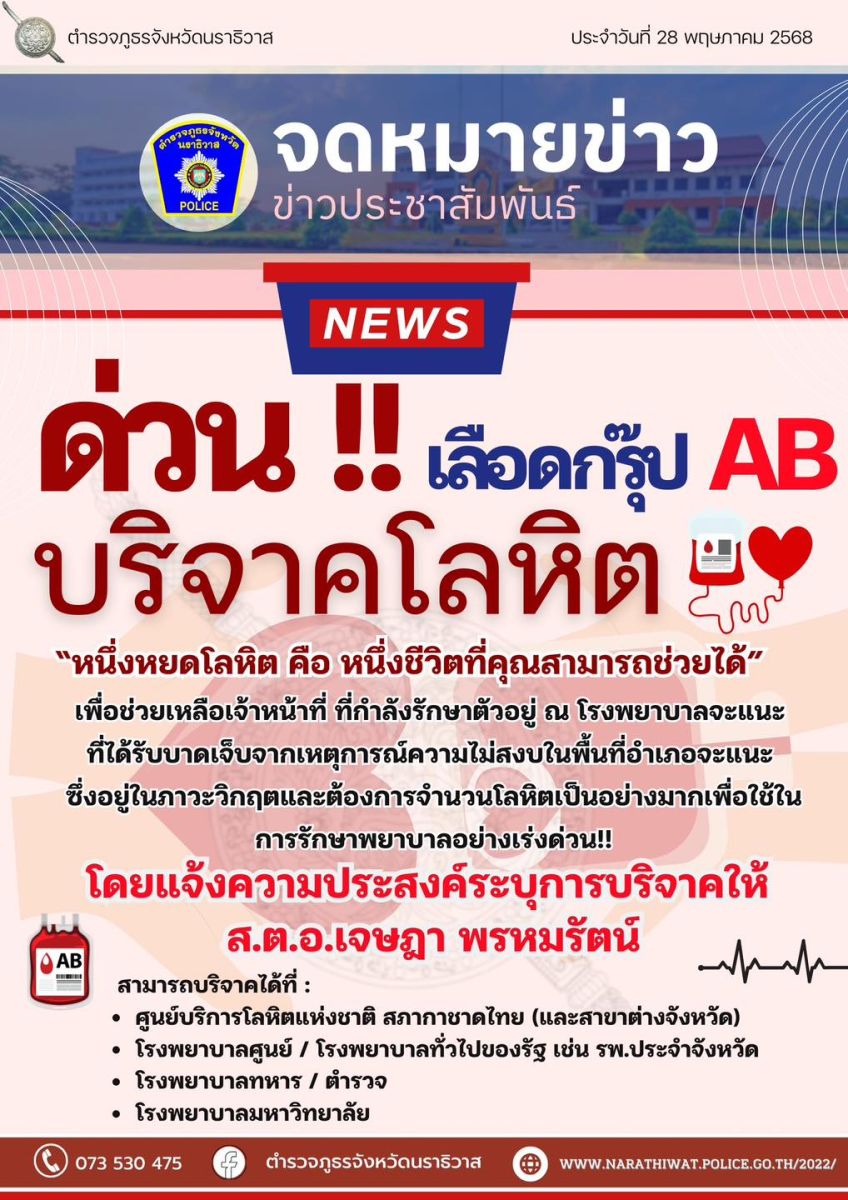 พร้อมกันนี้ ประชาสัมพันธ์ขอรับบริจาคเลือดเพื่อช่วยเหลือเจ้าหน้าที่ตำรวจที่ได้รับบาดเจ็บในเหตุการณ์ความไม่สงบในพื้นที่ จ.นราธิวาส ต้องการโลหิตกรุ๊ป AB อย่างเร่งด่วนในการรักษา