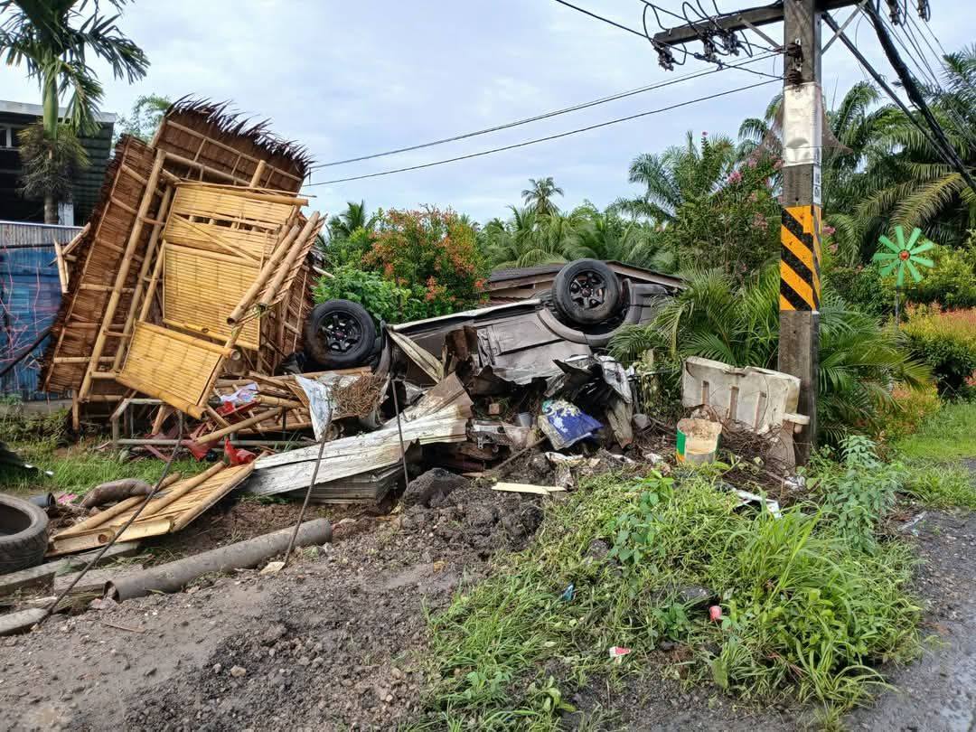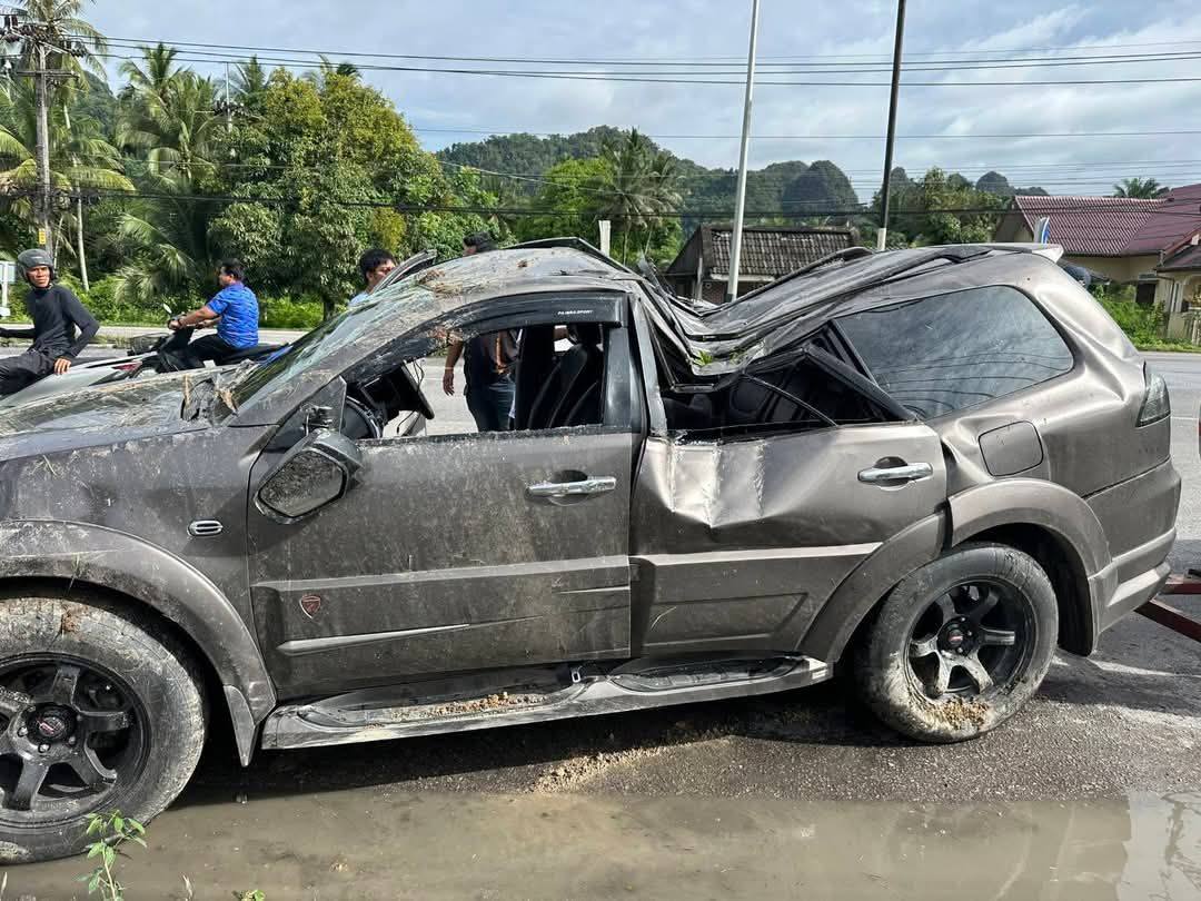 ที่เกิดเหตุ พบรถอเนกประสงค์ มิตซูบิชิ ปาร์เจโร่ สีเทา ป้ายทะเบียน กระบี่ ลักษณะเสียหลักหลุดออกข้างทาง พุ่งชนซุ้มไม้ไผ่หน้าร้านรับซื้อของเก่า แล้วพลิกหงายท้องล้อชี้ฟ้า สภาพรถหลังคายุบ ภายในรถมีคนขับและผู้โดยสาร เป็นพ่อ-แม่ และลูก 2 คน ซึ่งนับว่าโชคดีที่คนขับได้บาดเจ็บเพียงเล็กน้อย ขณะที่แม่และลูก 2 คนปลอดภัย