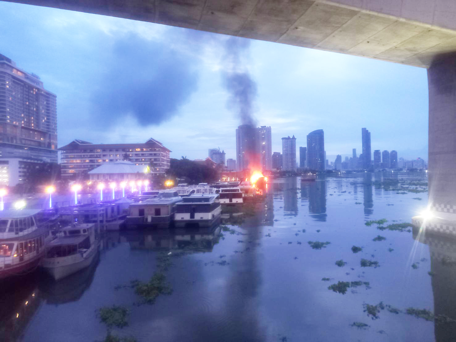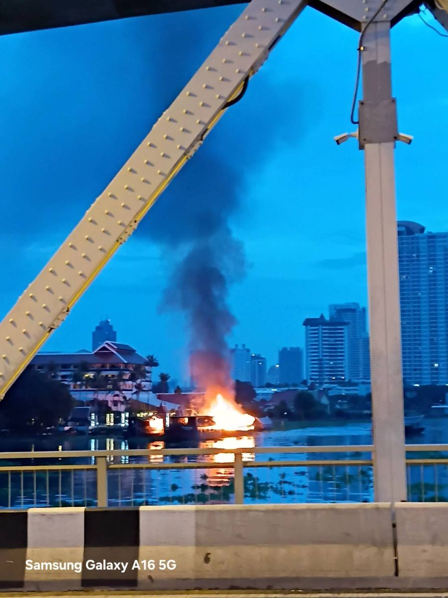 เหตุไฟไหม้เรือ ริมแม่น้ำเจ้าพระยา บริเวณท่าเรือย่านเจริญนคร จนท.เร่งระดมฉีดน้ำสกัดเพลิง