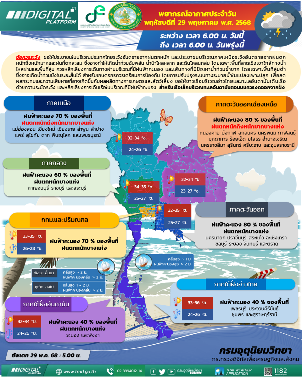 ลักษณะอากาศทั่วไป วันที่ 29 พฤษภาคม 2568 พยากรณ์อากาศ 24 ชั่วโมงข้างหน้า ประเทศไทยตอนบนยังคงมีฝนตกหนักบางแห่ง โดยภาคเหนือและภาคตะวันออกเฉียงเหนือมีฝนตกหนักถึงหนักมาก ขณะที่ขอให้ประชาชนในบริเวณดังกล่าวระวังอันตรายจากฝนตกหนักถึงหนักมากและฝนที่ตกสะสม ซึ่งอาจทำให้เกิดน้ำท่วมฉับพลัน น้ำป่าไหลหลาก และดินโคลนถล่ม