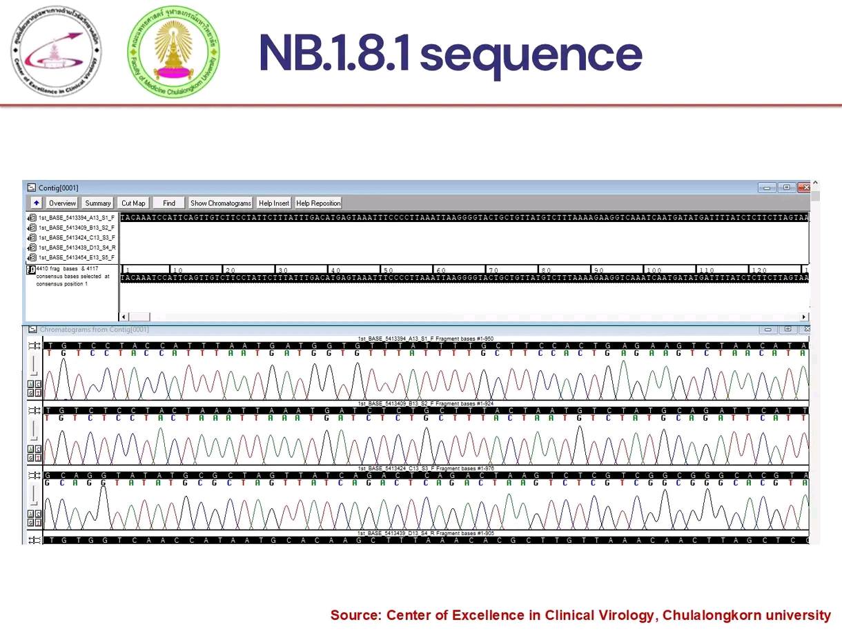 โดยทำการศึกษาที่ศูนย์ของเรา ส่วนใหญ่เป็นในเขตกรุงเทพฯ สายพันธุ์ที่พบ เป็นสายพันธุ์ล่าสุด คือ NB.1.8.1 เป็นสายพันธุ์ที่ทันสมัยกำลังจะระบาดใหญ่ทั่วโลก โดย สายพันธุ์นี้ถ้าดูตามรูปจะเป็นลูกหลานเหลนโหลน ของ XDV ส่วน XDV ก็เป็นเหลนของโอมิครอน ไม่ได้แตกลูกหลานจากสายพันธุ์ XEC ที่ระบาดมาก่อนหน้านี้
