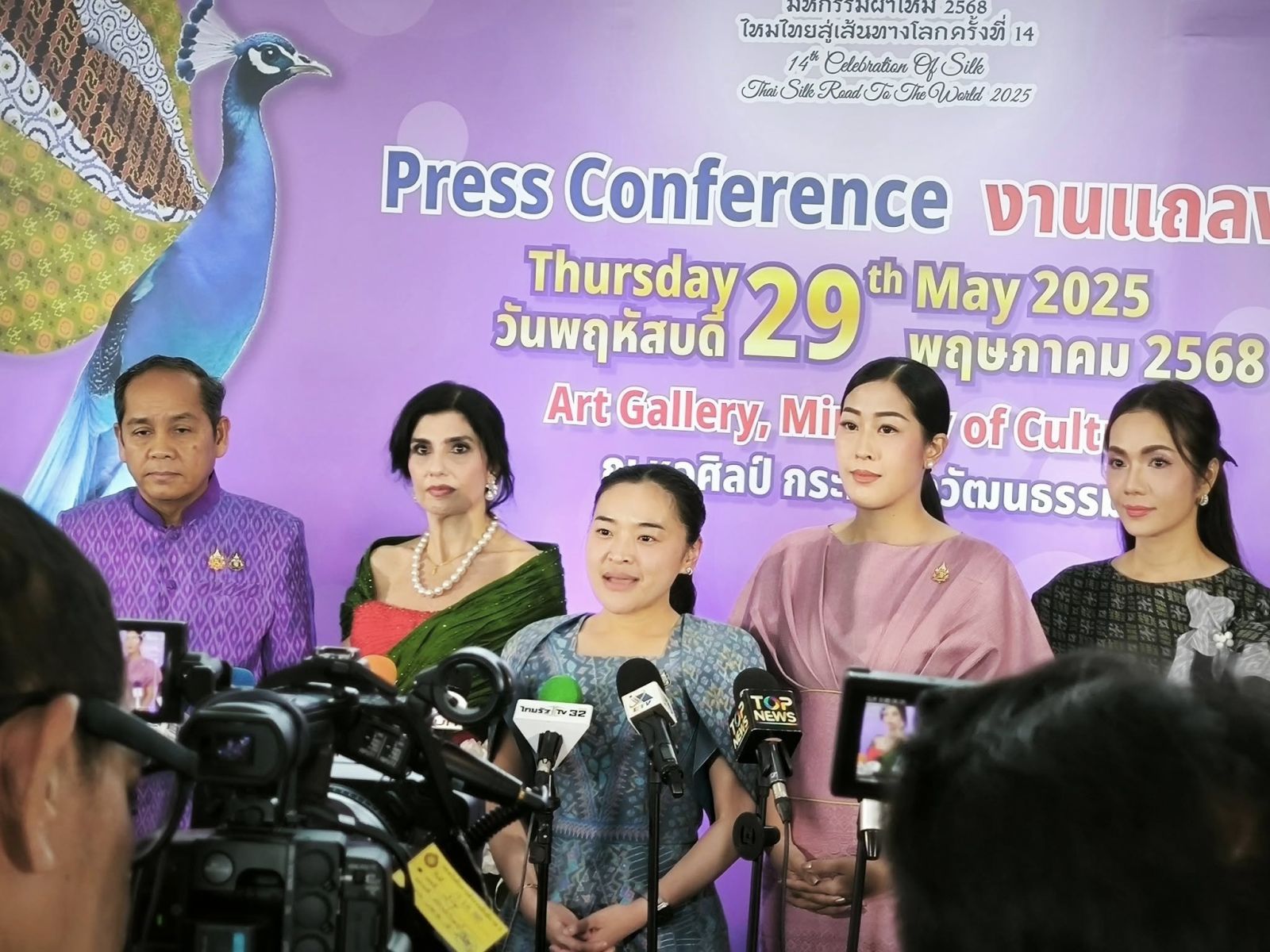 โชว์ Soft Power “ผ้าไหมไทย” สุดยิ่งใหญ่แห่งปี เฉลิมพระเกียรติฯ 47 พรรษา สมเด็จพระนางเจ้าสุทิดา พัชรสุธาพิมลลักษณ พระบรมราชินี วธ. ผนึกกำลังสมาคมส่งเสริมผ้าไหมไทยและวัฒนธรรมไทย กระทรวงศึกษาธิการ สำนักงานคณะกรรมการการอาชีวศึกษา กระทรวงการอุดมศึกษา วิทยาศาสตร์ วิจัยและนวัตกรรม สำนักงานการวิจัยแห่งชาติ กรมประชาสัมพันธ์ การท่องเที่ยวแห่งประเทศไทย แถลงข่าวจัดงาน “มหกรรมผ้าไหม ไหมไทยสู่เส้นทางโลก ครั้งที่ 14” ชมนิทรรศการเทิดพระเกียรติฯ ครม.-ทูต กว่า 88 ประเทศ เดินแฟชั่นโชว์สุดตระการตา อวดโฉมชุดผ้าไหมไทยฝีมือนักศึกษาไทย ในวันที่ 21 มิถุนายน 2568 ณ หอประชุมกองทัพเรือ พร้อมโชว์ชุดผ้าไหมไทย 25 - 29 มิถุนายน 2568 ณ ลาน Eden ศูนย์การค้าเซ็นทรัลเวิลด์ (CentralWorld)
