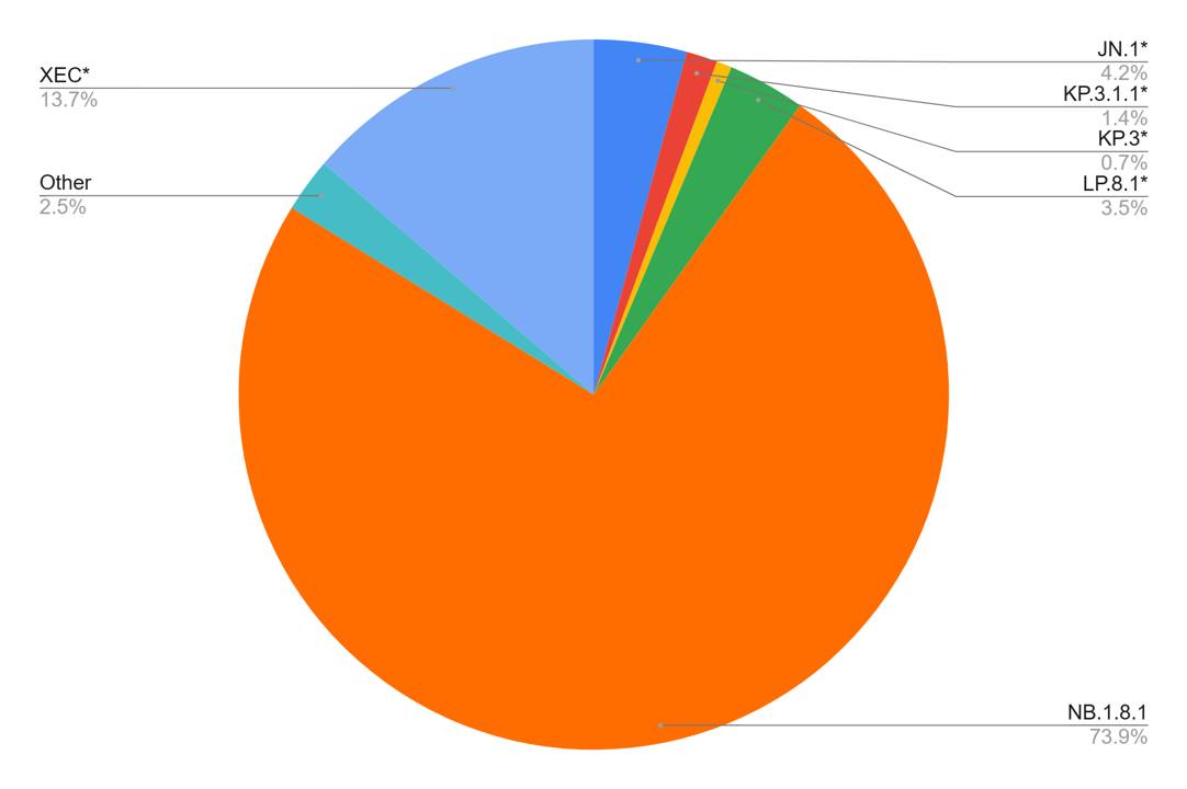 • XEC*: จำนวนผู้ติดเชื้อค่อนข้างคงที่ในช่วงเดือนมกราคมถึงเมษายนแต่เพิ่มขึ้นเล็กน้อยในเดือนพฤษภาคม