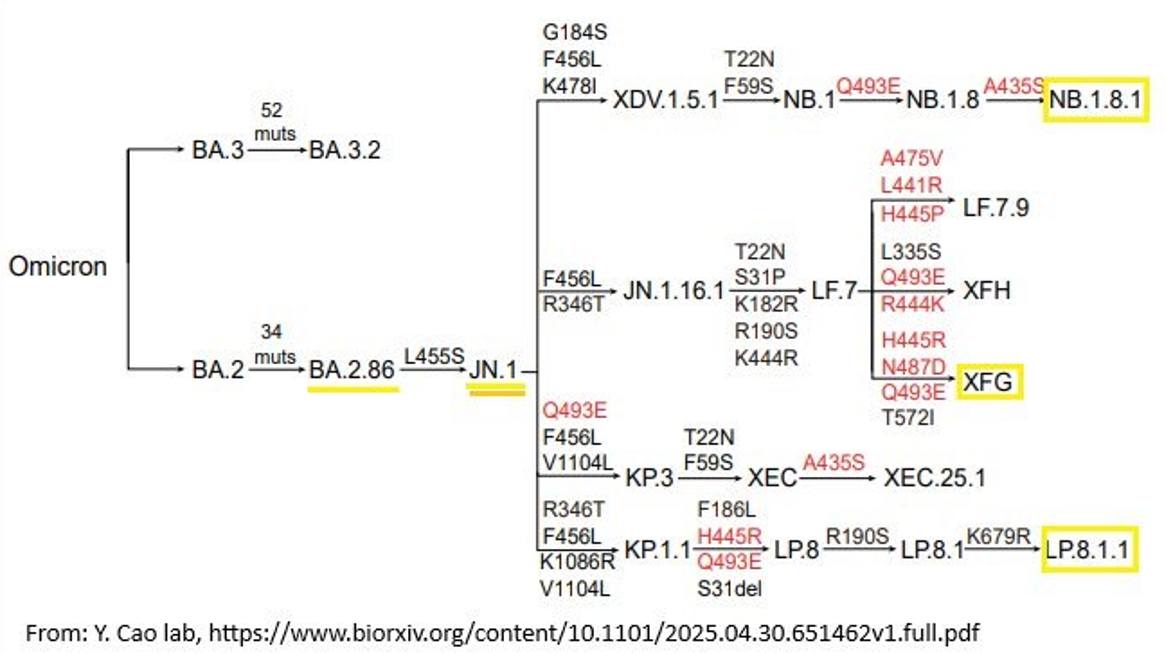 • NB.1.8.1: ไม่พบผู้ติดเชื้อสายพันธุ์นี้ในเดือนมกราคมถึงมีนาคม แต่เพิ่มขึ้นอย่างมากในเดือนเมษายน (43 ราย) และพฤษภาคม (167 ราย) จำนวนผู้ติดเชื้อรวม 210 ราย