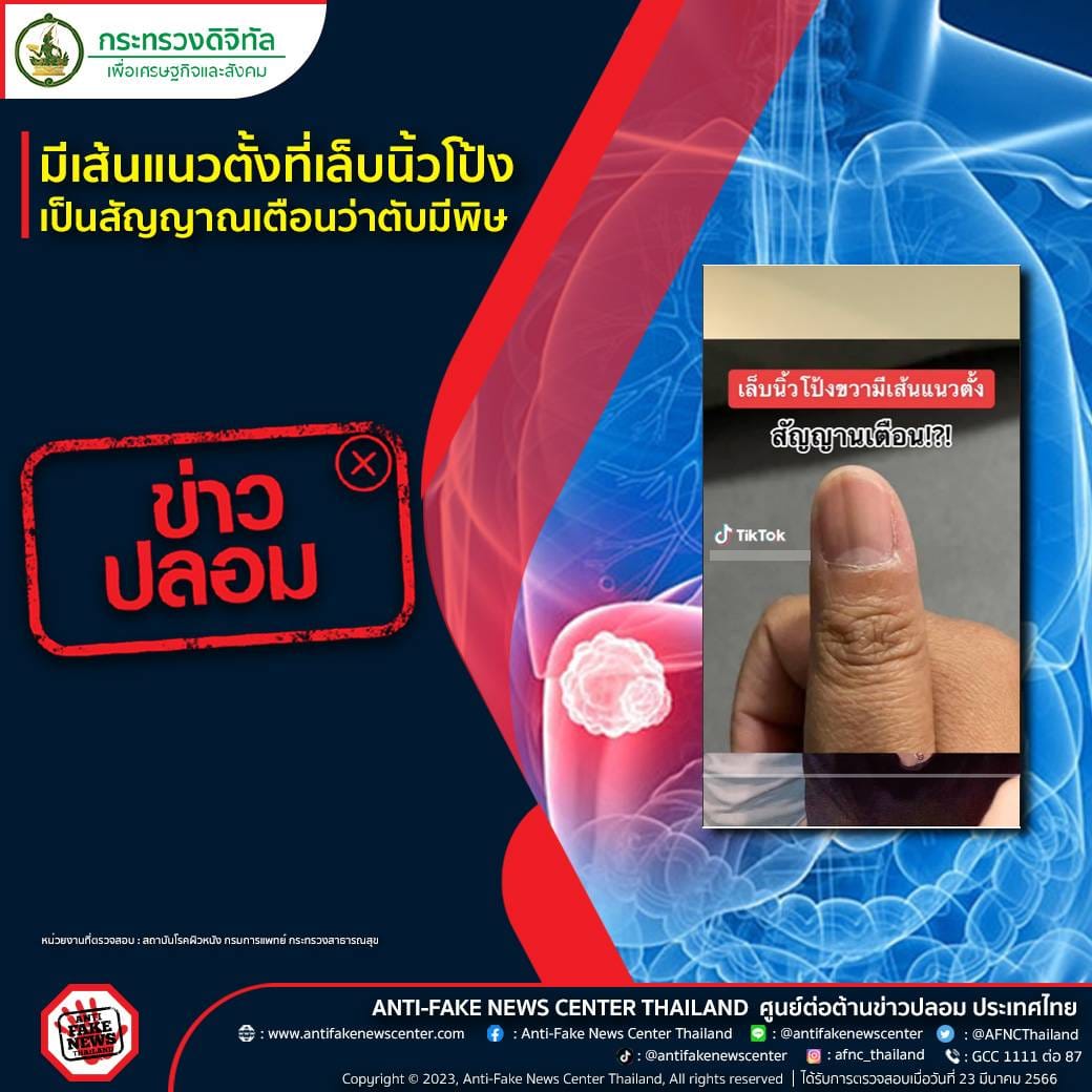 จากกรณีที่มีผู้โพสต์เตือนถึงข้อมูลด้านสุขภาพที่ระบุว่า เล็บนิ้วโป้งมีเส้นแนวตั้ง เป็นสัญญาณเตือนว่าตับมีพิษ ทางสถาบันโรคผิวหนัง กรมการแพทย์ กระทรวงสาธารณสุข ได้ตรวจสอบข้อมูลและชี้แจงว่า เล็บผิดปกติที่มีลักษณะเป็นเส้นสีดำหรือสีน้ำตาลแนวตั้งบริเวณหน้าเล็บนั้น เป็นความผิดปกติซึ่งกันเรียกว่า Longitudinal melanonychia โดยการแสดงอาการแตกต่างกันในแต่ละคน ทั้งสีที่อาจมีตั้งแต่สีน้ำตาลอ่อนไปจนถึงสีน้ำตาลเข้ม อาจมีสีดำอาจสม่ำเสมอ หรือไม่สม่ำเสมอ ขนาดก็เป็นไปได้ตั้งแต่ขีดเล็ก ๆ ไม่ถึง 1 มิลลิเมตร ไปจนถึงปื้นสีดำทั้งเล็บ และอาจมีแค่เส้นเดียว หลายเส้นก็ได้ ขึ้นอยู่กับสาเหตุที่ทำให้เกิดอาการดังกล่าว