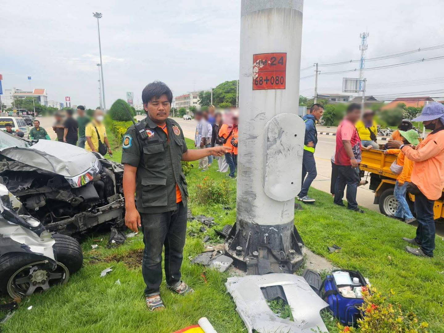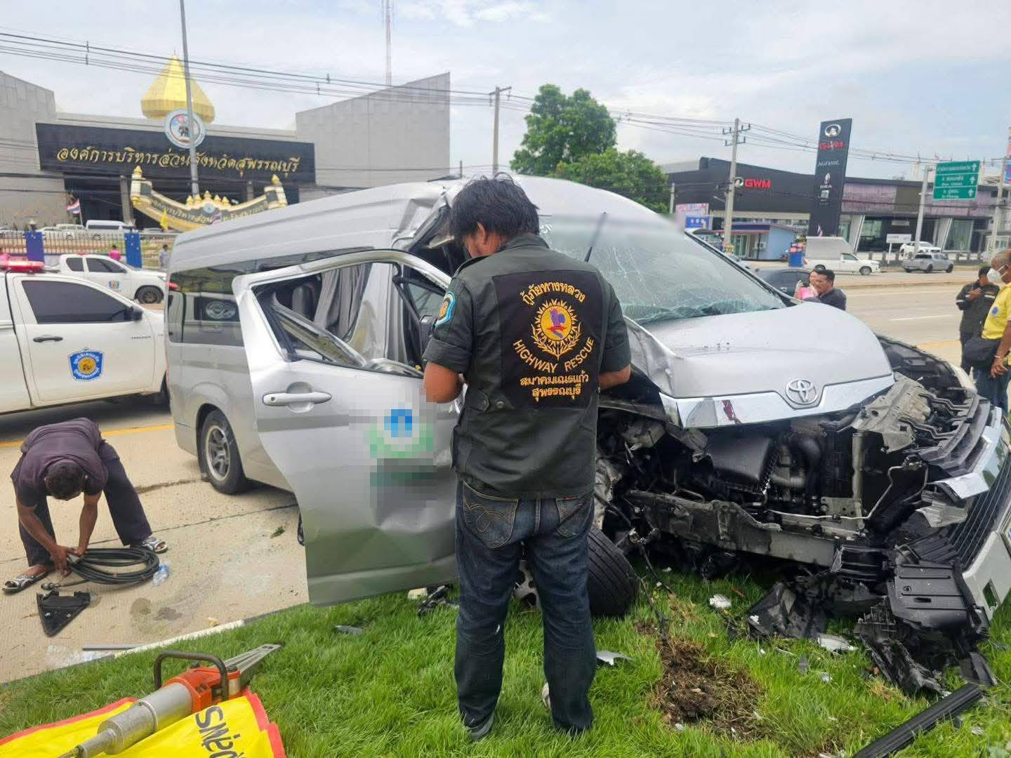 รถตู้ รพ.ชื่อดังใน กทม. ชนเสาไฟเกาะกลางที่เมืองสุพรรณบุรี นศ.แพทย์และคนขับได้รับบาดเจ็บ อาสากู้ภัยงัดรถช่วยเหลือและนำส่ง รพ.