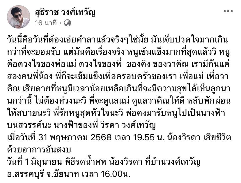 จากไปอย่างสงบ! "วิรดา วงศ์เทวัญ" น้องสาว กุ้ง สุธิราช หลังป่วยไข้เลือดออกรักษาตัวนานเป็นปี ล่าสุดกุ้ง สุธิราช โพสต์ผ่านเฟซบุ๊ก ได้เเจ้งข่าวร้าย