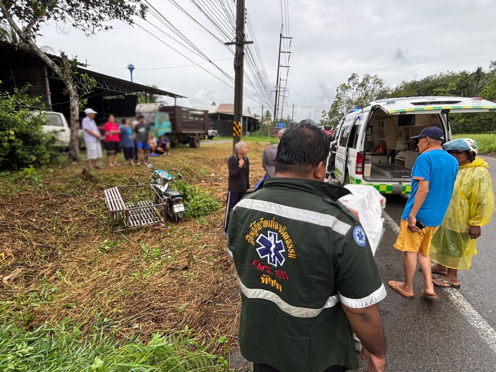คุณป้าวัย 60 กว่าปีขี่รถจักรยานยนต์พ่วงข้าง เสียหลักลงข้างทาง เสียชีวิตริมถนนเพชรเกษม จ.พังงา