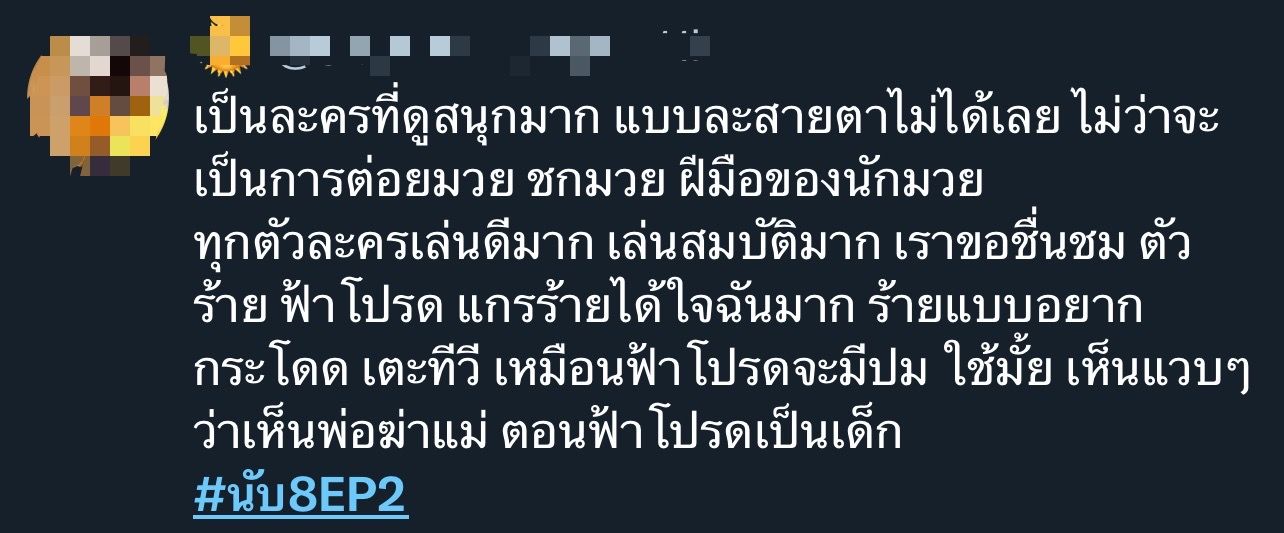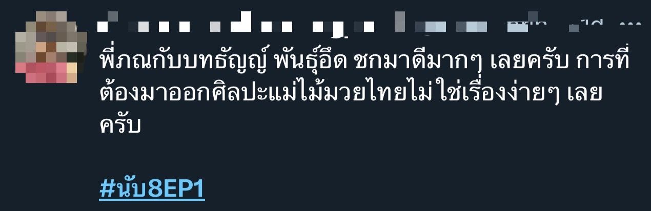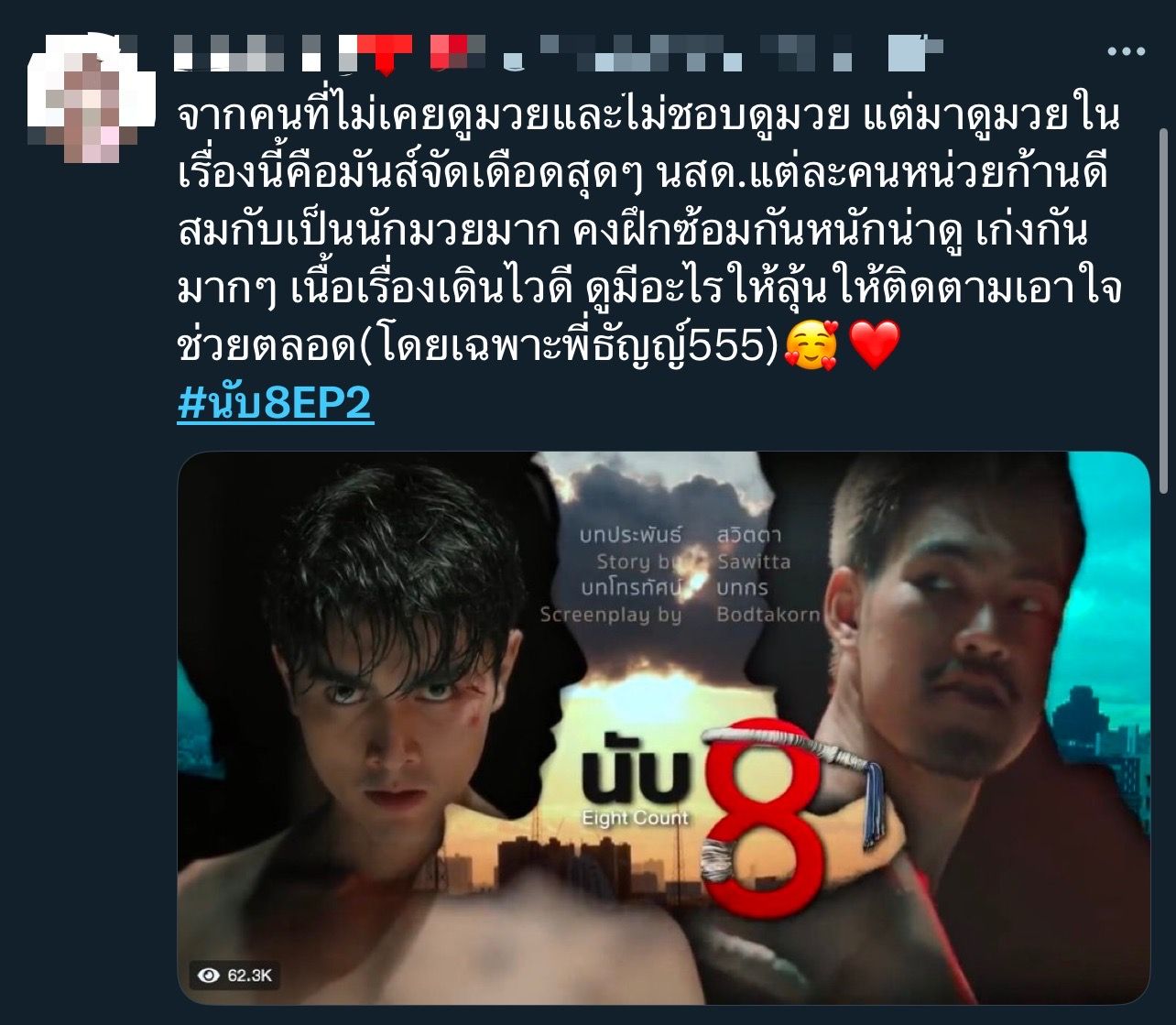 เปิดตัวมาก็ตีหัวเข้าบ้านอย่างแรง สำหรับละคร เรื่อง “นับ8” ทางช่อง 3 ที่พลิกแนวละครแบบใหม่ที่ไม่เคยเห็นที่ไหนมาก่อนกับการตีแผ่วงการมวยไทย โดยผู้จัดฯ ดีกรีลูกเจ้าของค่ายมวยตัวจริง “คุณปิ่น-ณัฏฐนันท์ ฉวีวงษ์” ที่ซัดเรตติ้ง อีพี 1 ไปแบบไม่ธรรมดาในพื้นที่กรุงเทพฯ ไปมากถึง 2.9 กลุ่มผู้ชมอายุ 15 ปี ขึ้นไป หรือ 15 BU+ (Bangkok and Urban) 2.3 ในอีพี 2 ในพื้นที่กรุงเทพฯ ไปมากถึง 3.0 กลุ่มผู้ชมอายุ 15 ปี ขึ้นไป หรือ 15 BU+ (Bangkok and Urban) 2.5