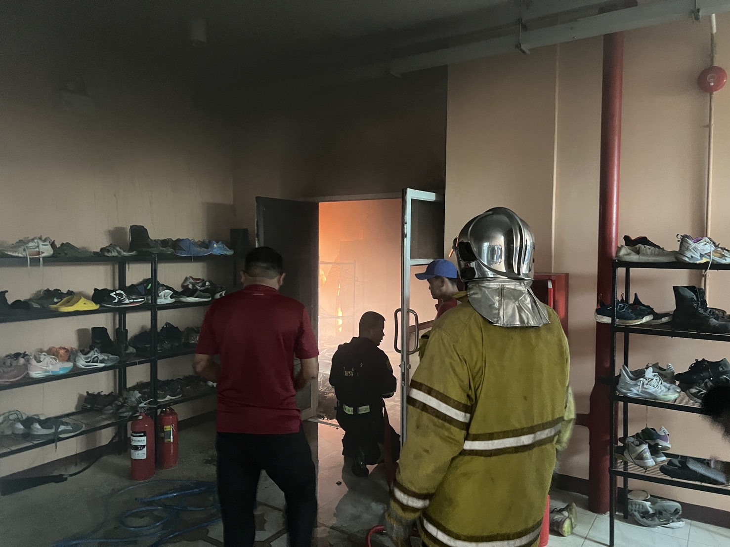 ที่เกิดเหตุเป็นอาคารสูง 10 ชั้นไฟลุกไหม้บริเวณชั้น 4 เป็นซึ่งเป็นที่ห้องพักและห้องเก็บเสื้อผ้าของนักฟุตบอลโรงเรียน เจ้าหน้าที่ดับเพลิงและรถดับเพลิงว่า 10 คันเร่งต่อสายน้ำขึ้นจุดเกิดเหตุและใช้น้ำฉีดเพื่อไม่ให้ลุกลามไปยังห้องใกล้เคียงโดยใช้เวลาประมาณ 20 นาทีจึงสามารถควบคุมเพลิงได้ หลังเพลิงสงบลงพบว่าจุดเกิดเหตุเป็นห้องเก็บเสื้อผ้า และรองเท้ากีฬา เพลิงได้ลุกไหม้กองเสื้อผ้าและตู้เสื้อผ้าเสียหาย ขณะเกิดเหตุไม่มีนักเรียนอยู่ในห้องพัก