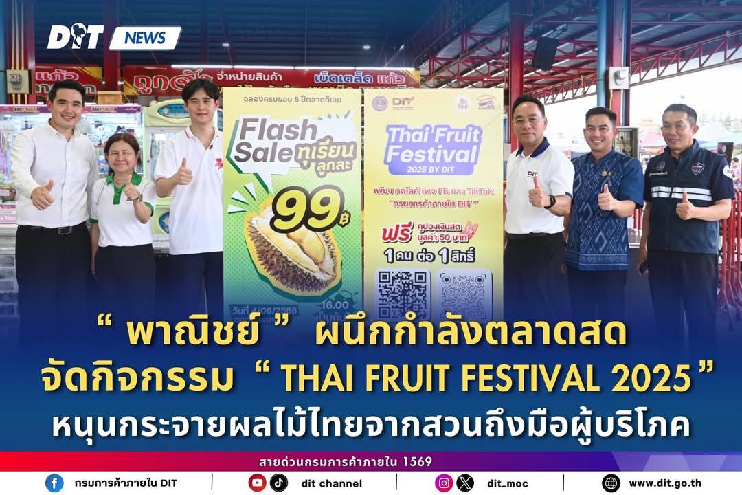 กรมการค้าภายในจับมือ 13 ตลาดสดทั่วกรุง เร่งระบายผลไม้วันละ 50 ตัน โดยคิกออฟที่ตลาดกิเลน กับโปรโมชั่นจัดเต็ม ทุเรียนลูกละ 99 บาท เพื่อให้ประชาชนเข้าถึงผลไม้คุณภาพในราคาประหยัดพร้อมเตรียมจัดกิจกรรมใหญ่กลางกรุง ‘Thai Fruit Festival 2025’ ที่สยามสแควร์ 19–22 มิ.ย.นี้ เพื่อช่วยดันราคาผลผลิตให้เกษตรกร พร้อมยกระดับการบริโภคในประเทศ