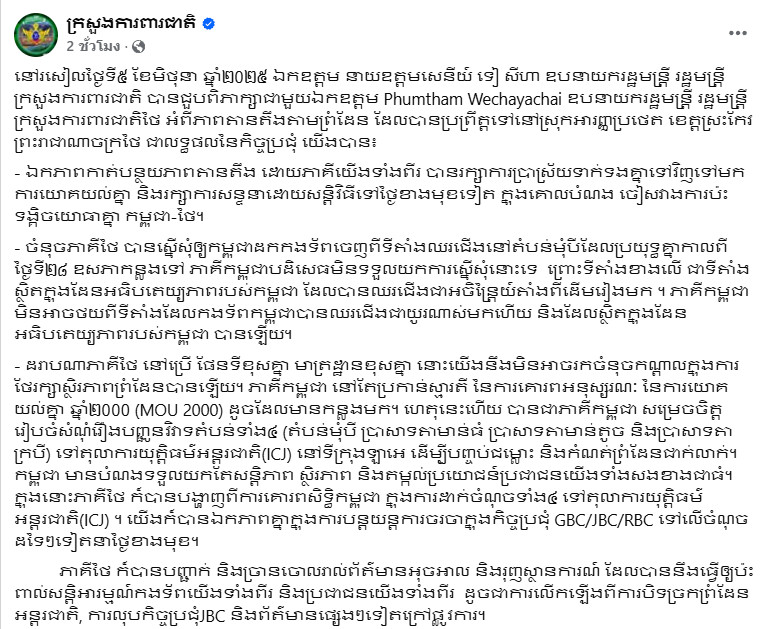 พล.อ.เซยฮา ย้ำว่า ทั้งสองฝ่ายยังคงต้องยืนยันที่จะลดความตึงเครียด และหลีกเลี่ยงการเผชิญหน้าด้วยอาวุธ เขาได้โพสต์โซเชียลมีเดียว่า เราตกลงที่จะรักษาช่องทางการสื่อสารที่เปิดกว้าง ความเข้าใจร่วมกัน และเจรจาอย่างสันติ ป้องกันไม่ให้เกิดความขัดแย้งทางทหารระหว่างกัมพูชาและไทย