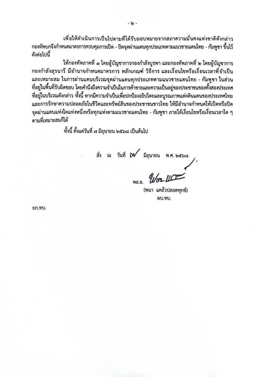 วันนี้ (7 มิถุนายน 2568) ที่กองบัญชาการกองทัพบก พลตรี วินธัย สุวารี โฆษกกองทัพบก เปิดเผยว่า พลเอก พนา แคล้วปลอดทุกข์ ผู้บัญชาการทหารบก ได้ลงนามในคำสั่งกำหนดอำนาจให้ผู้บัญชาการกองกำลังบูรพา และผู้บัญชาการกองกำลังสุรนารี มีอำนาจในการควบคุมการเปิด–ปิดจุดผ่านแดนทุกประเภทตลอดแนวชายแดนไทย–กัมพูชา โดยสามารถพิจารณากำหนดมาตรการ หลักเกณฑ์ วิธีการ และเงื่อนไขที่จำเป็น ให้เหมาะสมกับสถานการณ์ตามลำดับขั้นความเข้มงวดในแต่ละพื้นที่
