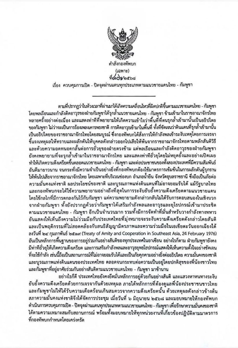 สำหรับรายละเอียดทั้งหมดในคำสั่งดังกล่าวสามารถติดตามได้ผ่านช่องทางการสื่อสารทางการของกองทัพบกที่เว็บไซต์ www.rta.mi.th เพื่อให้ประชาชนได้รับข้อมูลที่ถูกต้องจากทางราชการ