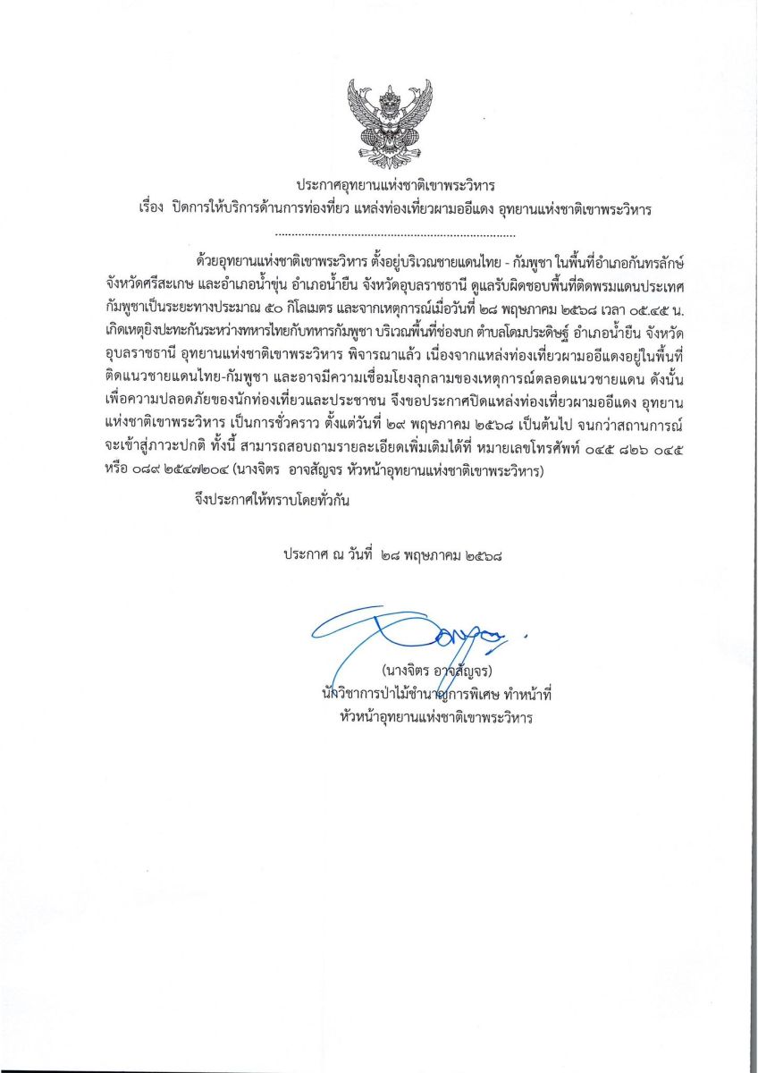 "ด้วยอุทยานแห่งชาติเขาพระวิหาร ตั้งอยู่บริเวณชายแดนไทย - กัมพูชา ในพื้นที่อำเภอกันทรลักษ์ จังหวัดศรีสะเกษ และอำเภอน้ำขุ่น อำเภอน้ำยืน จังหวัดอุบลราชธานี จากเหตุการณ์บริเวณช่องบก ต.โดมประดิษฐ์ อ.น้ำยืน จ.อุบลราชธานี ในวันที่ 28 พฤษภาคม 2568 และเหตุการณ์ที่เกิดขึ้นตลอดแนวชายแดน