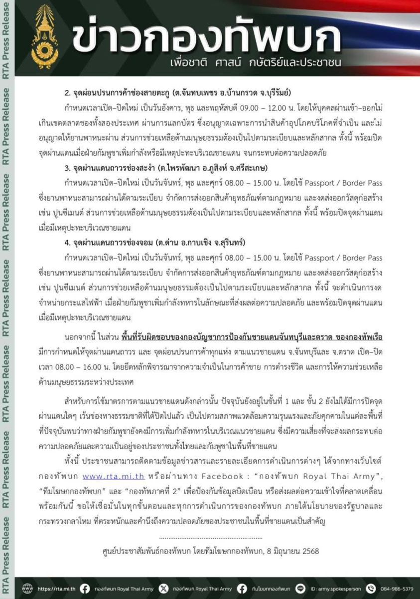 4. จุดผ่านแดนถาวรช่องจอม (ต.ด่าน อ.กาบเชิง จ.สุรินทร์) กำหนดเวลาเปิด–ปิดใหม่ เป็นวันจันทร์, พุธ และศุกร์ 08.00 – 15.00 น. โดยใช้ Passport / Border Pass ซึ่งยานพาหนะสามารถผ่านได้ตามระเบียบ จำกัดการส่งออกสินค้ายุทธภัณฑ์ตามกฎหมาย และงดส่งออกวัสดุก่อสร้าง เช่น ปูนซีเมนต์ ส่วนการช่วยเหลือด้านมนุษยธรรมต้องเป็นไปตามระเบียบและหลักสากล ทั้งนี้ จะดำเนินการงดจำหน่ายกระแสไฟฟ้า เมื่อฝ่ายกัมพูชาเพิ่มกำลังทหารในลักษณะที่ส่งผลต่อความปลอดภัย และพร้อมปิดจุดผ่านแดนเมื่อมีเหตุปะทะบริเวณชายแดน