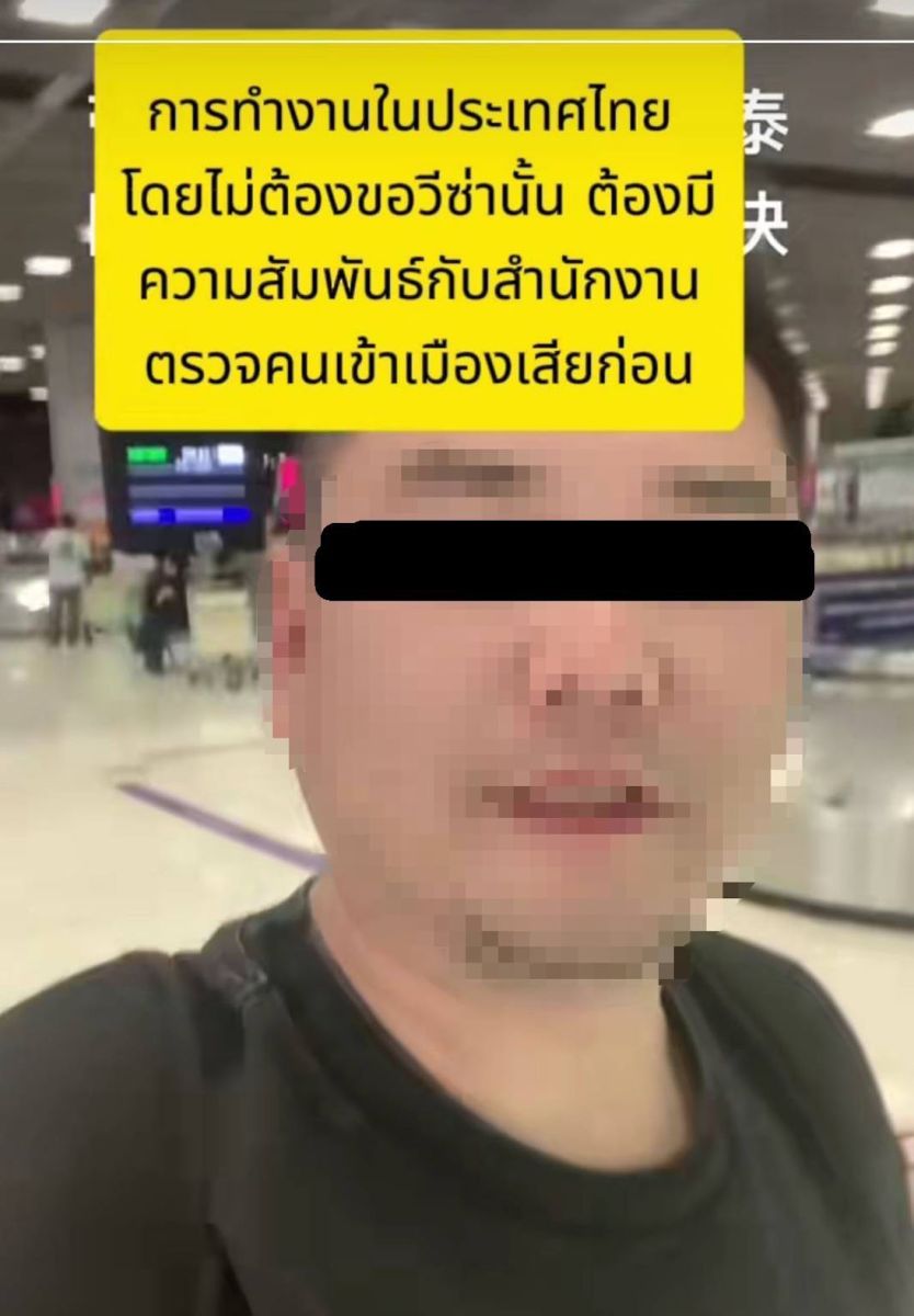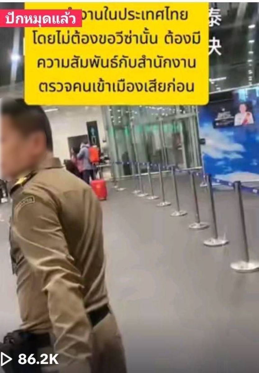 จากกรณีปรากฏคลิปเผยแพร่ในสื่อโซเชียลเป็นภาพคนจีนถ่ายเจ้าหน้าที่ ตม.สนามบิน โดยมีการตัดต่อคลิป และพูดเป็นภาษาจีน โดยแปลความคือ ช่วงเดินมาตอนแรกพูดว่า “จะแสดงให้ดูว่าจะเข้าประเทศไทยยังไง ตอนนี้ตรวจเข้มมาก” ตัดภาพตอนเดินเข้า พื้นที่ ตม.ขาเข้าพูดว่า “ตม.ขาเข้า” โดยถ่ายภาพเจ้าหน้าที่ ตม.ที่ถือหนังสือเดินทางนำหน้า ตัดภาพตอนอยู่บริเวณสายพานพูดว่า “หลังจากผ่านด่านมาก็มาหากระเป๋าของเรา อยู่ตรงไหนวะหาไม่เจอ” ตอนที่ถ่ายหน้าตัวเองระหว่างเดินออกจากสายพาน ผ่านศุลกากร พูดว่า “การมาไทยครั้งนี้ หากระเป๋าไม่เจอ จริงๆก็ง่ายๆแค่นี้ หรูหรา ขอแค่มีเงินหาน้องๆให้ช่วยเปิดทางหาของให้ก็ได้แล้ว เมื่อไทยก็แบบนี้ แต่จะมีอุปสรรคในการสื่อสารเล็กน้อย” และถ่ายภาพบริเวณทางออกถึงขึ้นรถพูดว่า “ถึงแล้วสนามบินสุวรรณภูมิ บายๆ ถ่ายด้านนอกสนามบิน แล้วก็บ่นกับคนขับรถ ว่าหายไปไหนมา และบ่นต่อว่า ดึงกูไว้จะเอาตังค์ เอาพาสไว้นึกว่าจะส่งกลับแล้ว” พร้อมกับขึ้นตัวหนังสือไทย เขียนว่า “การทำงานในประเทศไทย โดยไม่ต้องขอวีซ่านั้น ต้องมีความสัมพันธ์กับสำนักงานตรวจคนเข้าเมืองเสียก่อน”