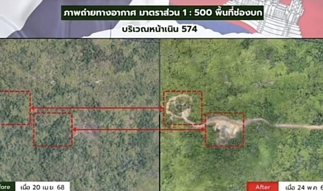 หลักฐานภาพถ่ายที่เปิดเผยโดยกรมแผนที่ทหารระบุชัดเจนว่าทหารกัมพูชาเพิ่งเริ่มเข้ามาวางกำลังในช่วงต้นปี มีนาคม-เมษายน 2568 ซึ่งแตกต่างจากที่สมเด็จฯ ฮุน เซน อดีตนายกรัฐมนตรีกัมพูชาอ้างว่ามีการยึดครองพื้นที่มานานก่อนการลงนามบันทึกความเข้าใจ (MoU) ปี 2543