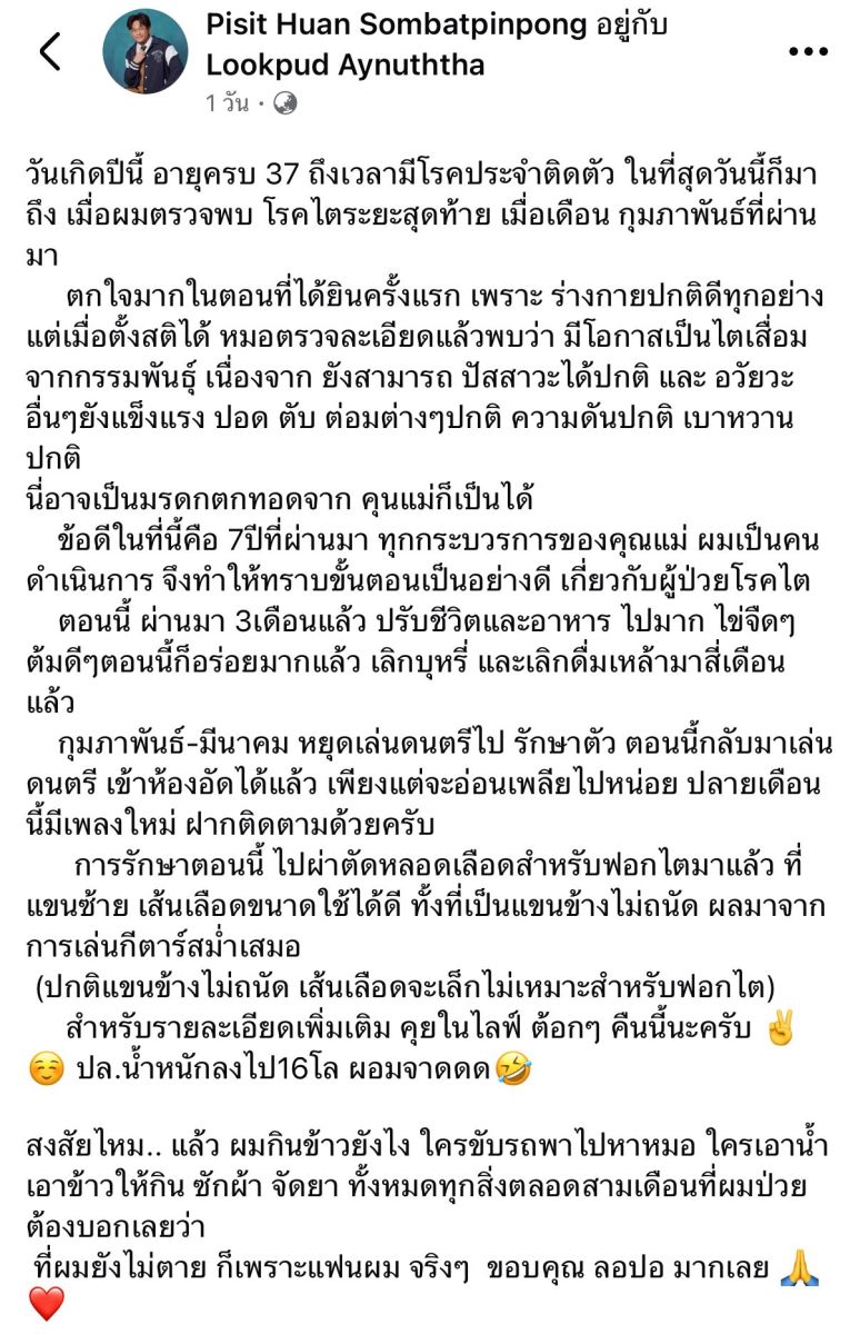 "วันเกิดปีนี้ อายุครบ 37 ถึงเวลามีโรคประจำติดตัว ในที่สุดวันนี้ก็มาถึง เมื่อผมตรวจพบ โรคไตระยะสุดท้าย เมื่อเดือน กุมภาพันธ์ ที่ผ่านมา ตกใจมากในตอนที่ได้ยินครั้งแรก เพราะร่างกายปกติดีทุกอย่าง แต่เมื่อตั้งสติได้ หมอตรวจละเอียดแล้วพบว่า มีโอกาสเป็นไตเสื่อมจากกรรมพันธุ์ เนื่องจากยังสามารถปัสสาวะได้ปกติ และอวัยวะอื่น ๆ ยังแข็งแรง ปอด ตับ ต่อมต่าง ๆ ปกติ ความดันปกติ เบาหวานปกติ นี่อาจเป็นมรดกตกทอดจากคุณแม่ก็เป็นได้ ข้อดีในที่นี้คือ 7 ปีที่ผ่านมา ทุกกระบวนการของคุณแม่ ผมเป็นคนดำเนินการ จึงทำให้ทราบขั้นตอนเป็นอย่างดี เกี่ยวกับผู้ป่วยโรคไต"