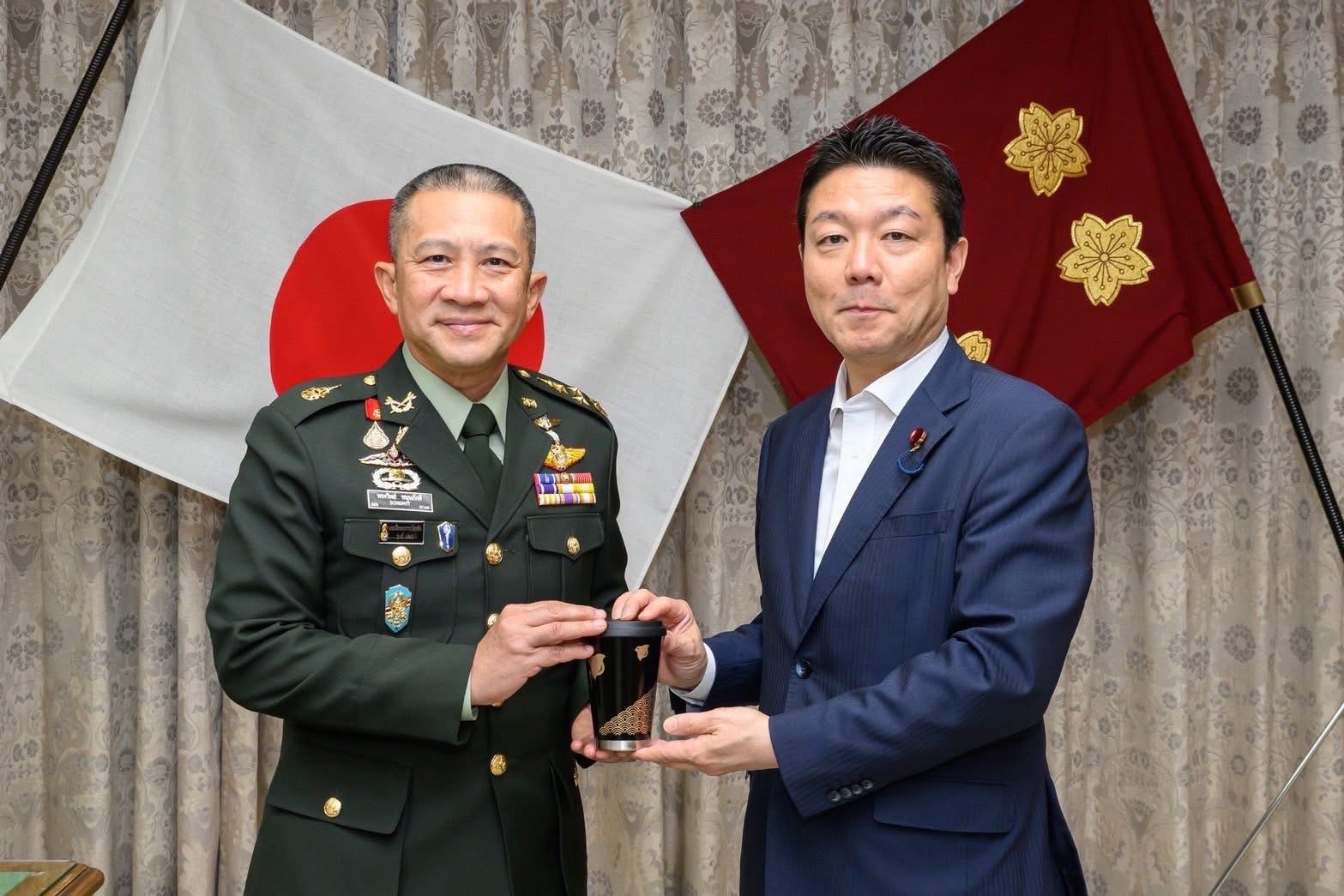 ทั้งนี้ ผู้บัญชาการทหารสูงสุดยังได้เข้าเยี่ยมคำนับ นาย Honda Taro รมช.กลาโหมญี่ปุ่น โดยทั้งสองฝ่ายได้กล่าวถึงความสัมพันธ์ฉันมิตรอันยาวนานระหว่างไทยและญี่ปุ่น ที่ดำเนินต่อเนื่องมากว่า 138 ปี ซึ่งได้ยกระดับสู่ความเป็น “หุ้นส่วนทางยุทธศาสตร์อย่างรอบด้าน” พร้อมยืนยันว่า กองทัพไทยยินดีที่จะร่วมมือกับกองกำลังป้องกันตนเองญี่ปุ่นอย่างเต็มที่ในทุกมิติ