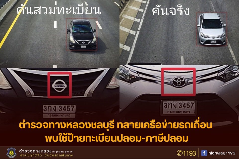 ตำรวจทางหลวงชลบุรี สืบสวนและจับกุมผู้ใช้รถผิดกฎหมาย 2 ราย หลังพบการใช้ป้ายทะเบียนปลอม โดยคดีแรกเป็นรถยนต์ NISSAN ALMERA สีดำ ที่ใช้ป้ายทะเบียนซ้ำกับรถ TOYOTA VIOS สีเทา เจ้าของป้ายยืนยันไม่เคยให้ใครยืมใช้