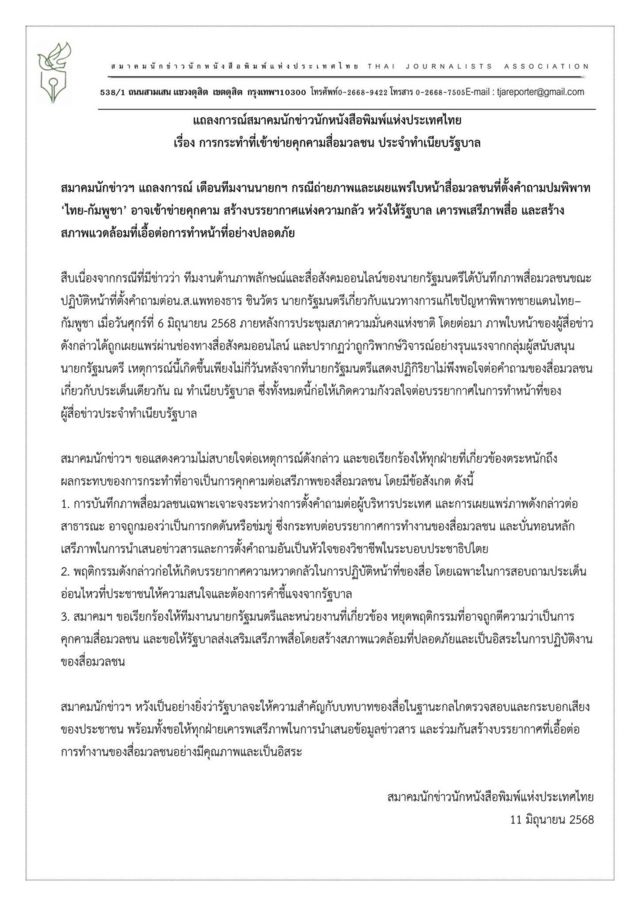 11 มิถุนายน 2568 สืบเนื่องจากกรณีที่มีข่าวว่า ทีมงานด้านภาพลักษณ์และสื่อสังคมออนไลน์ของนายกรัฐมนตรีได้บันทึกภาพสื่อมวลชนขณะปฏิบัติหน้าที่ตั้งคำถามต่อน.ส.แพทองธาร ชินวัตร นายกรัฐมนตรีเกี่ยวกับแนวทางการแก้ไขปัญหาพิพาทชายแดนไทย–กัมพูชา เมื่อวันศุกร์ที่ 6 มิถุนายน 2568 ภายหลังการประชุมสภาความมั่นคงแห่งชาติ โดยต่อมา ภาพใบหน้าของผู้สื่อข่าวดังกล่าวได้ถูกเผยแพร่ผ่านช่องทางสื่อสังคมออนไลน์ และปรากฏว่าถูกวิพากษ์วิจารณ์อย่างรุนแรงจากกลุ่มผู้สนับสนุนนายกรัฐมนตรี เหตุการณ์นี้เกิดขึ้นเพียงไม่กี่วันหลังจากที่นายกรัฐมนตรีแสดงปฏิกิริยาไม่พึงพอใจต่อคำถามของสื่อมวลชนเกี่ยวกับประเด็นเดียวกัน ณ ทำเนียบรัฐบาล ซึ่งทั้งหมดนี้ก่อให้เกิดความกังวลใจต่อบรรยากาศในการทำหน้าที่ของผู้สื่อข่าวประจำทำเนียบรัฐบาล