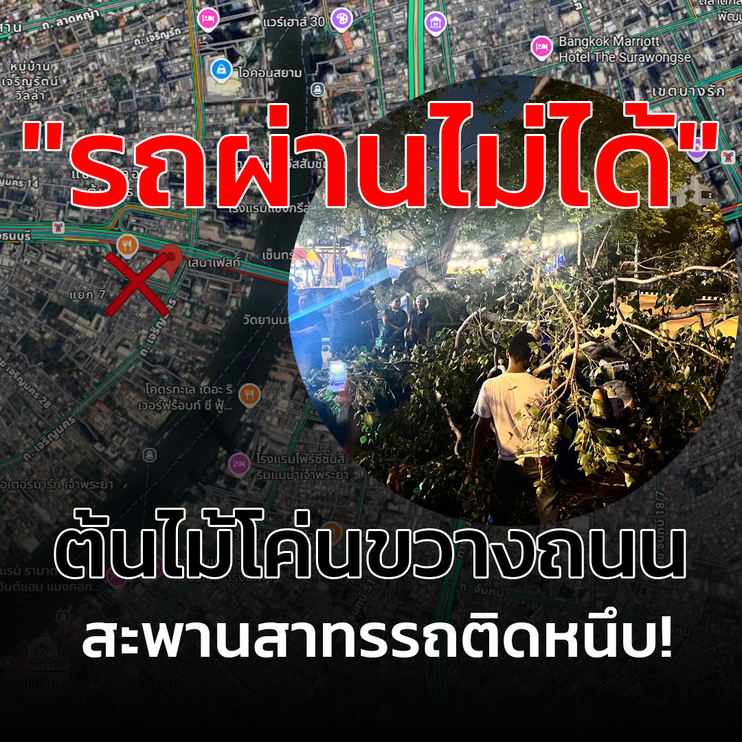 ต้นไม้ขนาดใหญ่ล้มทับรถจยย. และหักลงมาขวางจราจร 2 ช่องทาง (ไม่สามารถผ่านได้) ผู้บาดเจ็บ 1 ราย ส่งรพ.สมิติเวช ธนบุรี ท้ายเต็มแยกสาทร-สุรศักดิ์ เริ่มต่อเนื่อง ถ.สุรศักดิ์ และสาทรใต้