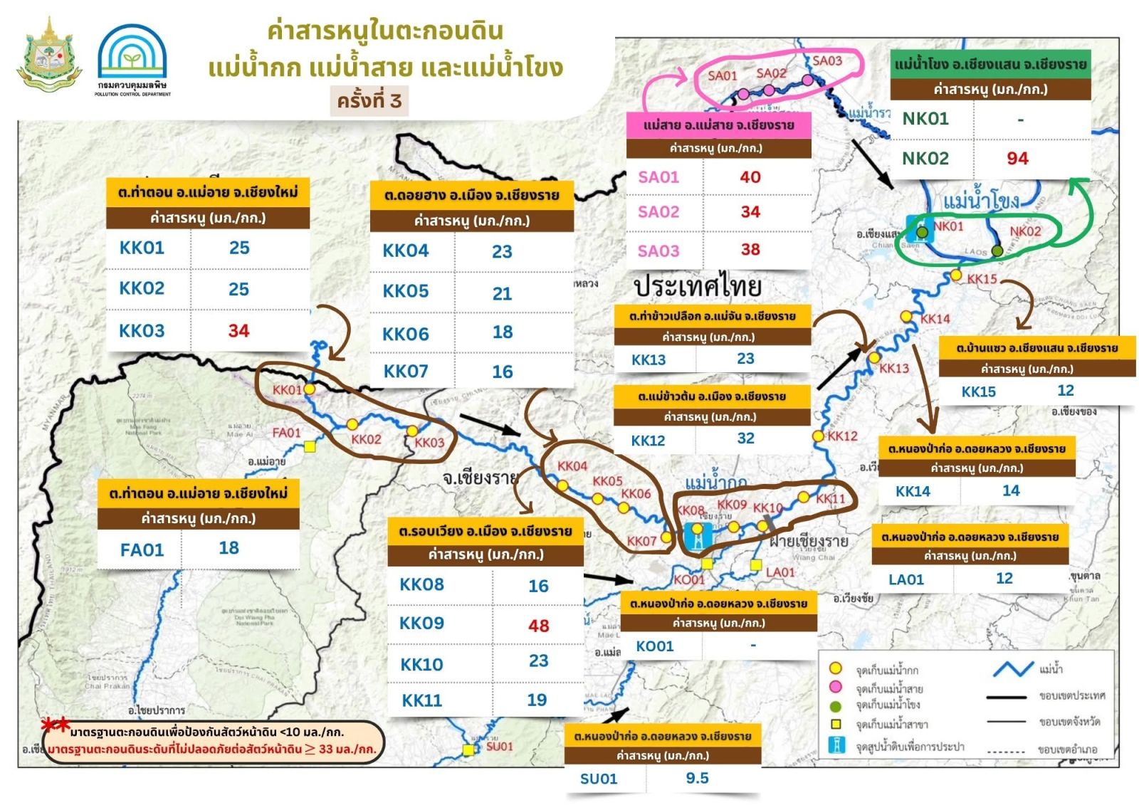 วันนี้ (12 มิ.ย.68) กรมควบคุมมลพิษ (คพ.) กระทรวงทรัพยากรธรรมชาติและสิ่งแวดล้อม สรุปผลการเก็บตัวอย่างและวิเคราะห์ตะกอนดินในแม่น้ำกก ลำน้ำสาขา และแม่น้ำโขง ครั้งที่ 3 หลังเกิดความขุ่นผิดปกติในแม่น้ำกกอย่างต่อเนื่อง โดยผลการตรวจพบว่าสารหนูยังคงเกินมาตรฐานในหลายจุด และบางพื้นที่มีความเสี่ยงต่อสุขภาพของประชาชนหากบริโภคปลาในปริมาณมาก