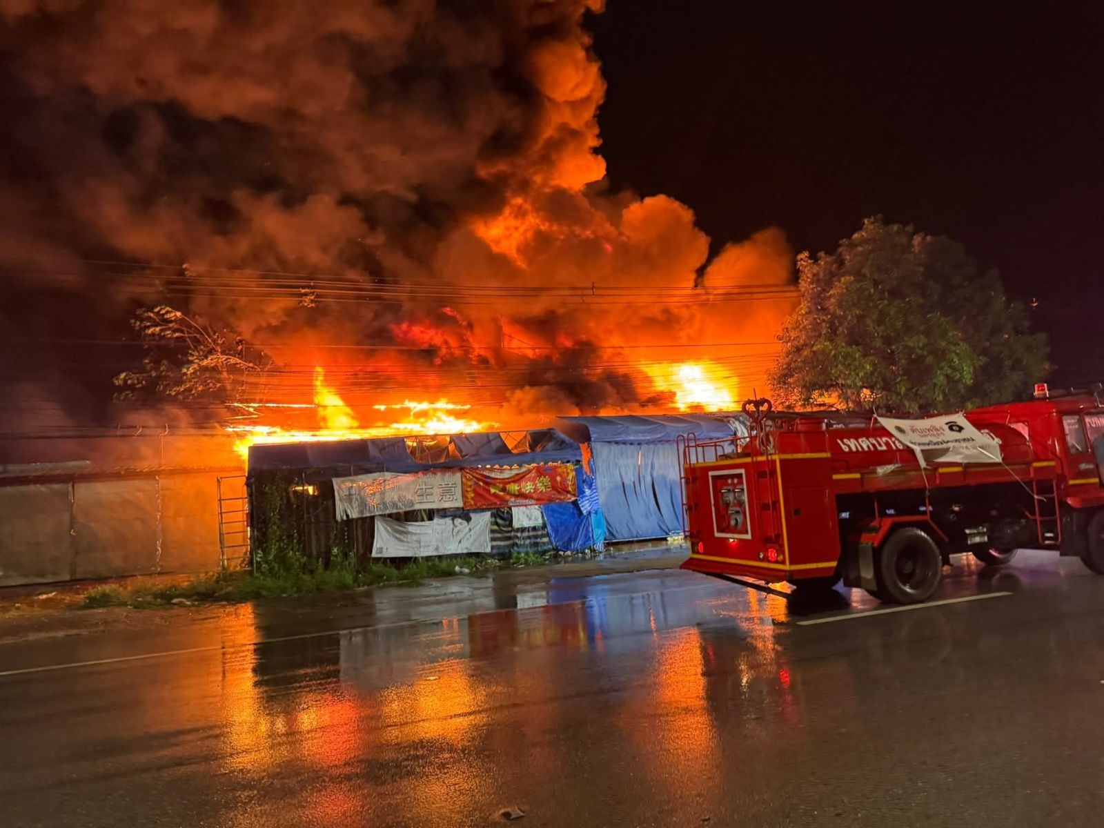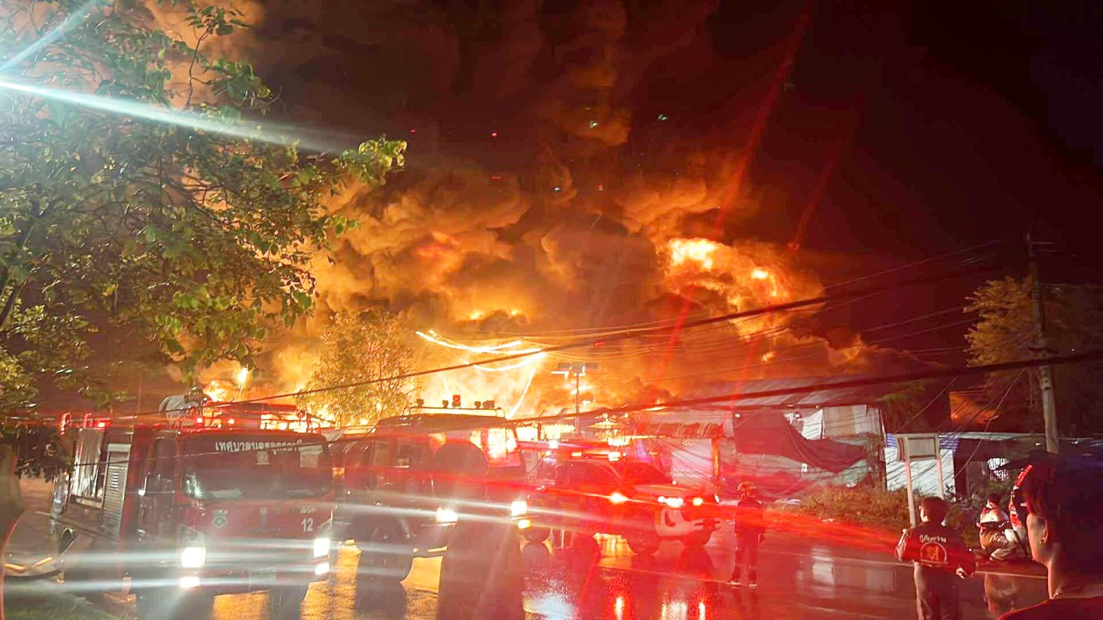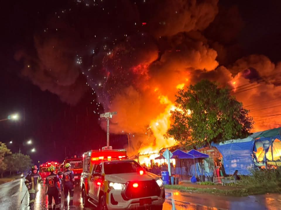 ที่เกิดเหตุ ลักาณะเป็นโกดังเก็บสินค้าขายส่งพลาสติกขนาดใหญ่ เพลิงลุกไหม้อย่างรุนแรงเจ้าหน้าที่ดับเพลิงหลายหน่วยงานระดมฉีดน้ำควบคุมเพลิง ยังไม่สามารถควบคุมเพลิงได้