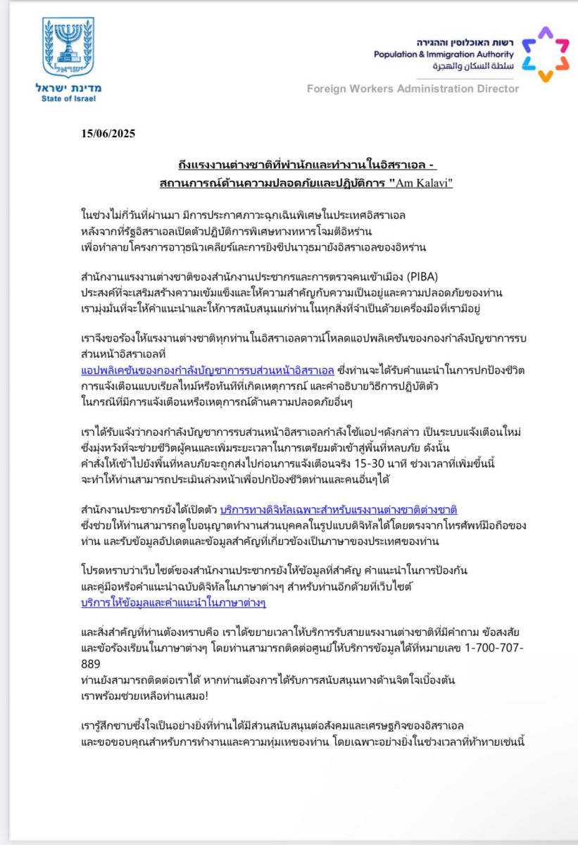 16 มิ.ย.2568 สถานเอกอัครราชทูตไทย ณ กรุงเทลอาวีฟ Royal Thai Embassy, Tel Aviv แจ้งข่าวถึงคนไทยในอิสราเอล เนื่องจากสำนักงานประชากรและตรวจคนเข้าเมืองอิสราเอล (PIBA) ออกประกาศข้อแนะนำภายใต้สถานการณ์ในอิสราเอลปัจจุบันสำหรับพี่น้องแรงงานไทยในอิสราเอล ถึงแรงงานต่างชาติที่พํานักและทํางานในอิสราเอล - สถานการณ์ด้านความปลอดภัยและปฏิบัติการ “Am Kalavi” ในช่วงไม่กี่วันที่ผ่านมา มีการประกาศภาวะฉุกเฉินพิเศษในประเทศอิสราเอล หลังจากที่รัฐอิสราเอลเปิดตัวปฏิบัติการพิเศษทางทหารโจมตีอิหร่าน เพื่อทําลายโครงการอาวุธนิวเคลียร์และการยิงขีปนาวุธมายังอิสราเอลของอิหร่าน