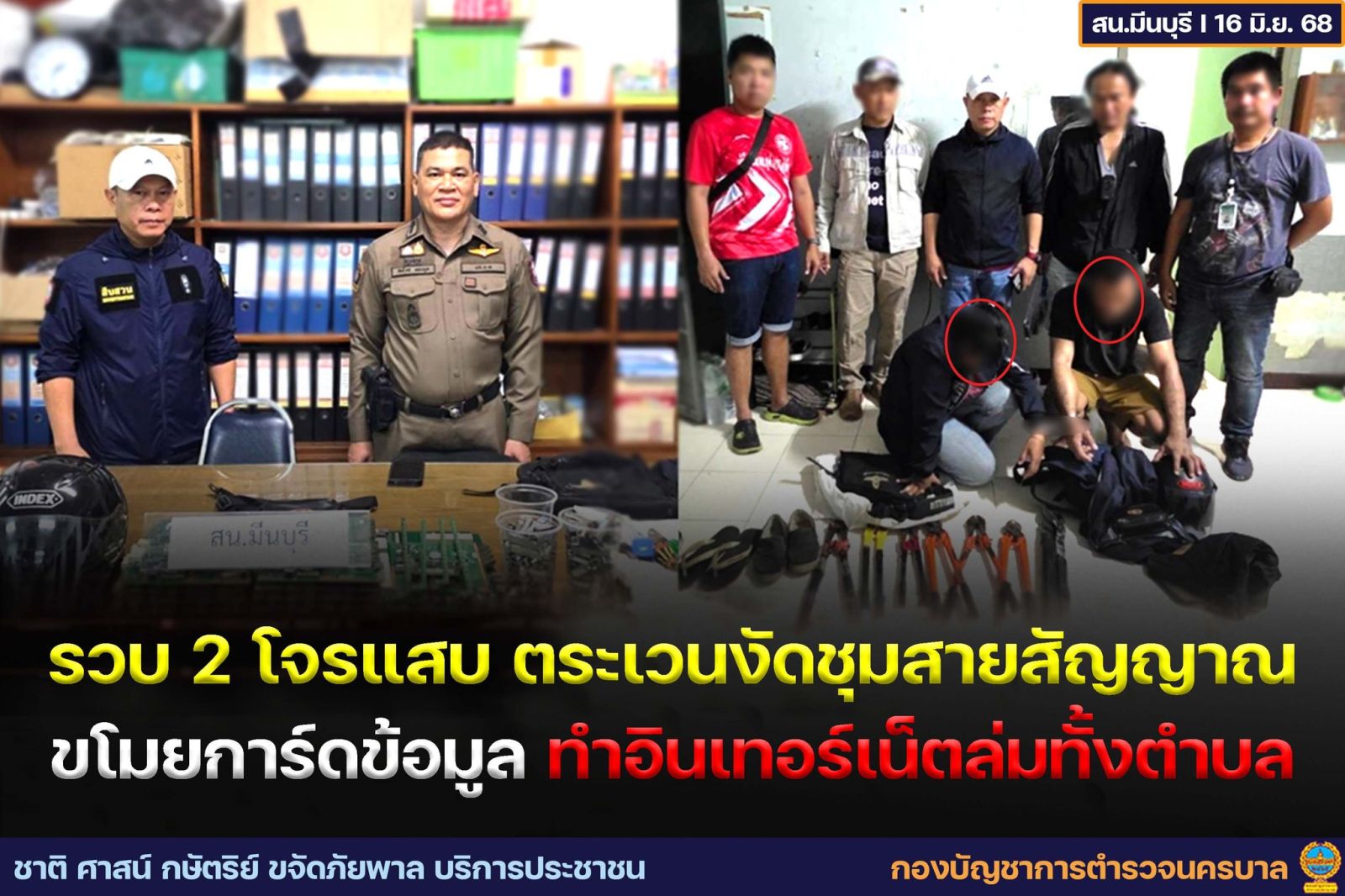 เมื่อวันที่ 15 มิถุนายน 2568 เวลาประมาณ 23.30 น. สืบเนื่องจากฝ่ายสืบสวน สน.มีนบุรี ได้รับแจ้งว่า มีคนร้ายก่อเหตุลักสายไฟสัญญาณโทรศัพท์ ที่ตั้งชุมสาย ในซอยสุวินทวงศ์ 18/1 พบว่าประตูเหล็กตู้ชุมสายถูกตัดและอุปกรณ์ชุมสายดังกล่าวก็มีร่อยรอยถูกตัดเช่นเดียวกัน ยังมีอุปกรณ์ชุมสายอื่นๆหลายอย่างได้หายไปส่งผลทำให้ระบบสัญญาณโทรศัพท์ล่มจำนวน 2 ชุมสาย ชาวบ้านเดือดร้อนและมีผู้เสียหายเข้าแจ้งความที่ สน.มีนบุรี จากการตรวจสอบจากกล้องวงจรปิดในที่เกิดเหตุพบคนร้ายชาย 1 คน และหญิง 1 คน ใช้รถจยย.คนละคัน ก่อนขี่รถหลบหนีไปปลายทางที่แฟลตเอื้ออาทรมีนบุรี ซอยรามอินทรา 127 นำกำลังจับกุมผู้ต้องหาทั้งคู่ได้ที่ห้องพักพร้อมกลางดังกล่าว และรถ จยย.จอดไว้อยู่ข้างแฟลต
