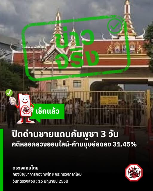 16 มิถุนายน 2568 เพจ Anti-Fake News Center Thailand โพสต์ข้อความระบุ "จากมาตรการจำกัดการผ่านแดนไทย-กัมพูชาของกองทัพบกส่งผลให้เห็นถึงคดีสแกมเมอร์และคดีค้ามนุษย์ ลดลงใน 3 วันที่ผ่านมา รวมถึงการเพิ่มความถี่ในการตรวจสอบ และประสานงานกับหน่วยงานด้านความมั่นคงและตำรวจชายแดน ส่งผลอย่างมีนัยสำคัญต่อสถานการณ์ด้านอาชญากรรมข้ามชาติ จำนวนคดี หลอกลวงออนไลน์ (Scammer) และ การค้ามนุษย์ ลดลงถึง 31.45% ตรวจสอบโดย กองบัญชาการกองทัพไทย"