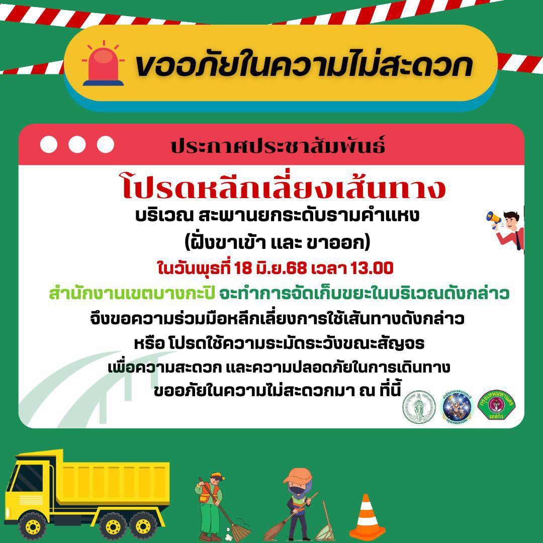 สำนักงานเขตบางกะปิ แจ้งผู้ใช้เส้นทาง หลีกเลี่ยง! ยกระดับรามคำแหง (ฝั่งขาเข้า และขาออก) ในวันที่ 18 มิ.ย. 68 เวลา 13.00 น. โดยจะทำความสะอาดเก็บขยะ จึงขอความร่วมมือหลีกเลี่ยงการใช้เส้นทาง หรือ โปรดใช้ความระมัดระวังขณะสัญจร เพื่อความสะดวกและความปลอดภัยในการเดินทาง