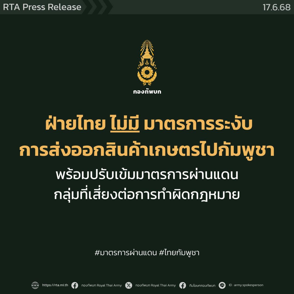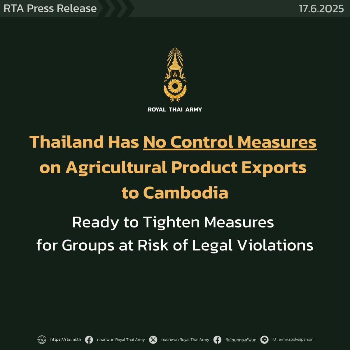 Today (17 June 2025) at RTA Headquarters, Major General Winthai Suvaree, Army spokesperson, provided clarification regarding control measures at Thai-Cambodian border crossing points concerning the export of agricultural products. He affirmed that Thailand's control measures at all border crossing points do not restrict the export of agricultural products in any way. Therefore, the report on the inability of farmers and business operators to export agricultural products, resulting in product backlog, is a consequence of import restriction measures by the Cambodian government. This clarification is provided to ensure accurate understanding among all sectors.