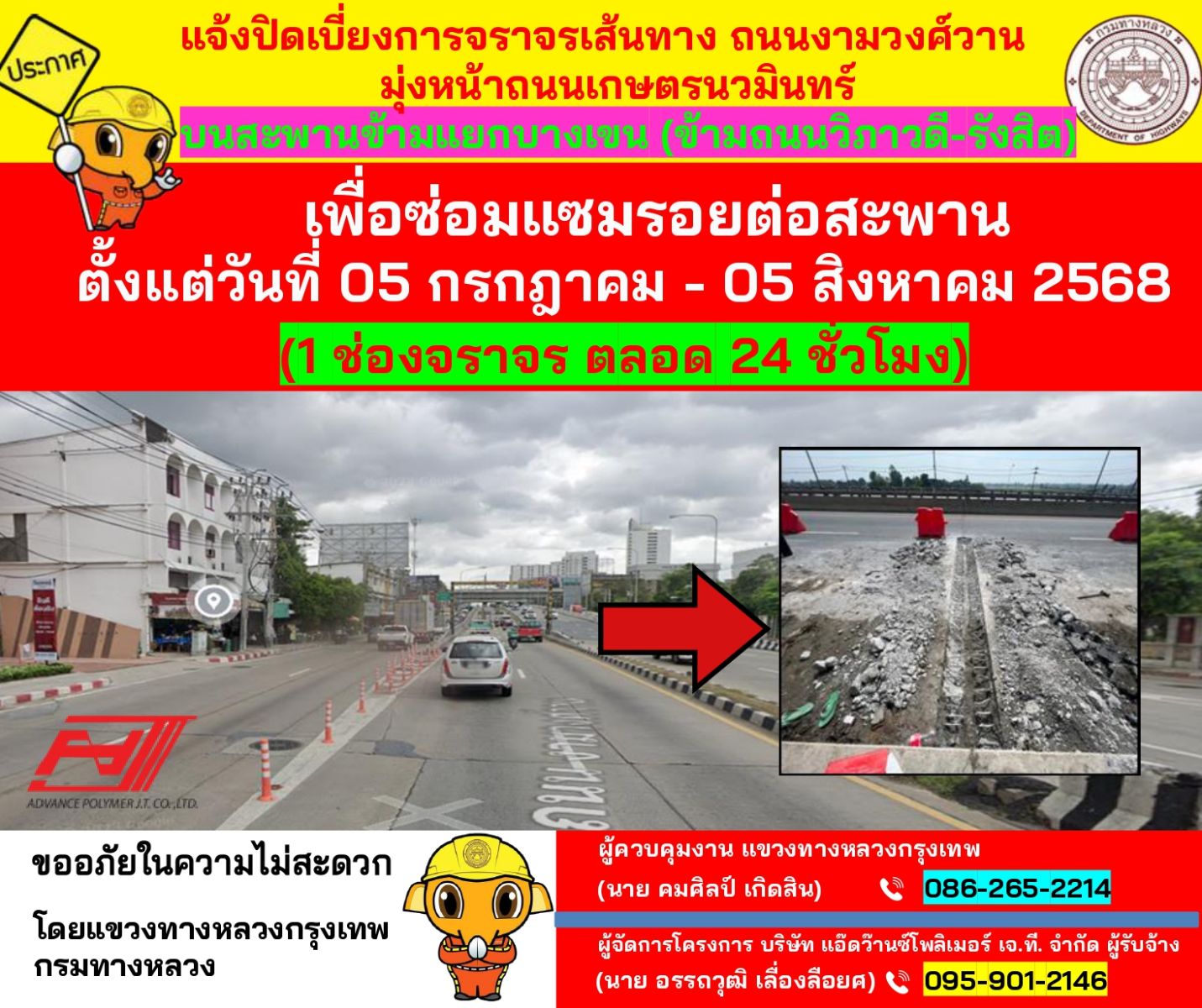 บนสะพานข้ามแยกบางเขน 1 ช่องจราจร ระหว่างวันที่ 5 ก.ค. - 5 ส.ค. 68 เพื่อซ่อมแซมรอยต่อสะพานฯ ตลอด 24 ชม.