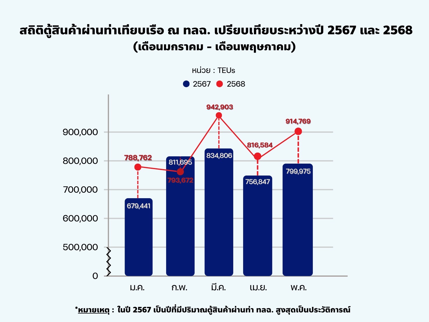 จากนโยบายประกาศเก็บภาษีนำเข้าสหรัฐฯ ทำให้มีการเร่งการขนส่งสินค้ามากขึ้น ส่งผลให้ปริมาณตู้สินค้าผ่านท่าเรือแหลมฉบัง (ทลฉ.) เพิ่มขึ้นกว่า 10% ในช่วง 5 เดือนแรกของปี 2568 การเพิ่มขึ้นของตู้สินค้าอย่างรวดเร็วและไม่ปกตินี้ ส่งผลให้ปริมาณรถบรรทุกหนาแน่น เกิดปัญหาจราจรติดขัดรุนแรงในพื้นที่เกินโครงสร้างพื้นฐานที่รองรับปริมาณตู้สินค้าและรถบรรทุกที่เข้ามาใช้บริการ ทลฉ. ณ ปัจจุบัน ประกอบกับการขนส่งทางเรือล่าช้าไม่สามารถเทียบท่าได้ตามกำหนดเวลา และตู้สินค้าคงค้างภายในพื้นที่เพิ่มขึ้นจำนวนมาก คาดว่าในปี 2568 จะมีรถบรรทุกมากกว่า 5.4 ล้านคัน/ปี (เฉลี่ยวันละ 15,000 คัน ซึ่งบางวันมีปริมาณรถสูงถึง 20,000 คัน/วัน)
