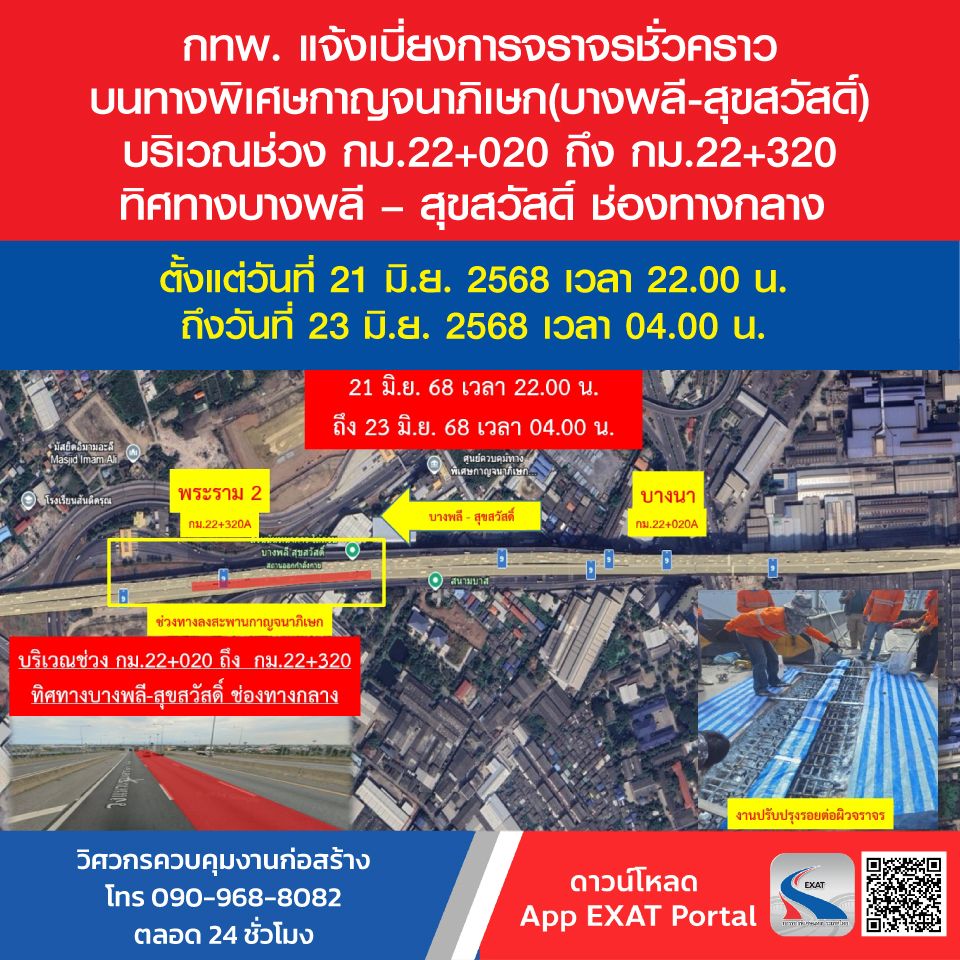 การทางพิเศษแห่งประเทศไทย (กทพ.) กระทรวงคมนาคม ได้ว่าจ้าง บริษัท ไทยวัฒน์วิศวการทาง จํากัด เป็นผู้รับจ้างดําเนินงานปรับปรุงผิวจราจรและรอยต่อทางพิเศษกาญจนาภิเษก (บางพลี - สุขสวัสดิ์) โดยผู้รับจ้าง จะเข้าดำเนินการปรับปรุงผิวจราจร และรอยต่อทางพิเศษกาญจนาภิเษก (บางพลี - สุขสวัสดิ์) จึงมีความจำเป็นจะต้องเบี่ยงการจราจรชั่วคราวบนทางพิเศษดังกล่าว บริเวณช่วง กม.22+020 ถึง กม.22+320 ทิศทางบางพลี – สุขสวัสดิ์ ช่องทางกลาง ตั้งแต่วันที่ 21 มิ.ย. 2568 เวลา 22.00 น. ถึงวันที่ 23 มิ.ย. 2568 เวลา 04.00 น.