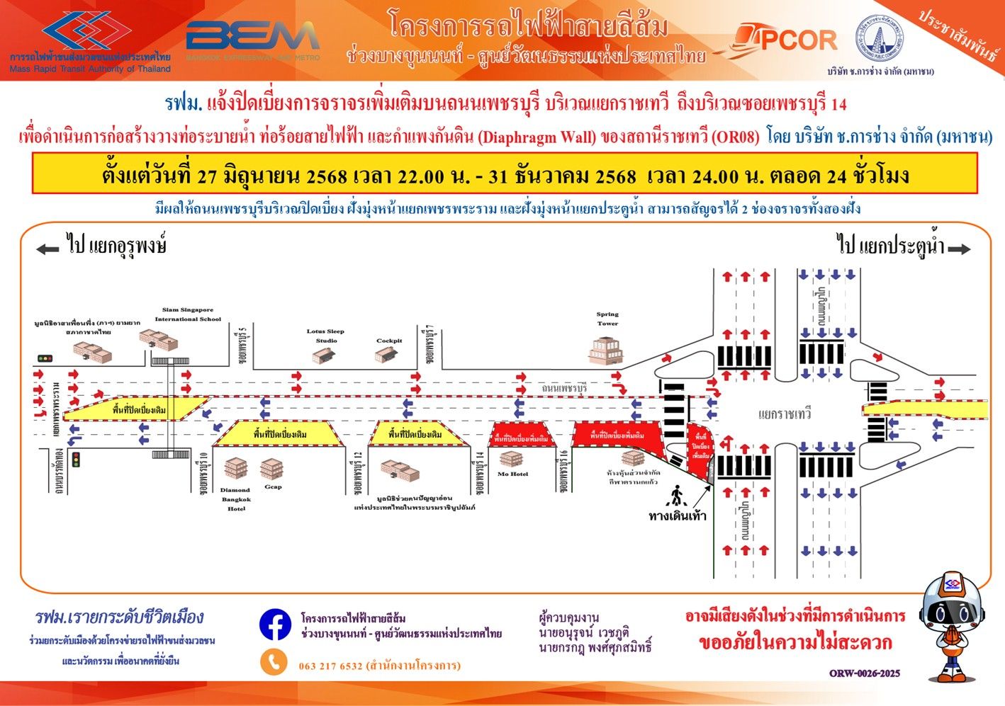 การรถไฟฟ้าขนส่งมวลชนแห่งประเทศไทย (รฟม.) แจ้งว่า บริษัท ช.การช่าง จำกัด (มหาชน) ผู้รับจ้างออกแบบและก่อสร้างอุโมงค์ทางวิ่งและสถานีใต้ดิน โครงการรถไฟฟ้าสายสีส้ม ช่วงบางขุนนนท์ – ศูนย์วัฒนธรรมแห่งประเทศไทย มีความจำเป็นต้องปิดเบี่ยงการจราจรเพิ่มเติม 2 ช่องจราจร บนถนนเพชรบุรี ฝั่งมุ่งหน้าแยกเพชรพระราม บริเวณแยกราชเทวี ถึงบริเวณซอยเพชรบุรี 14 เพื่อดำเนินการก่อสร้างวางท่อระบายน้ำ ท่อร้อยสายไฟฟ้า และกำแพงกันดิน (Diaphragm Wall) สถานีราชเทวี (OR08) ตั้งแต่วันที่ 27 มิถุนายน 2568 เวลา 22.00 น. – 31 ธันวาคม 2568 เวลา 24.00 น. ตลอด 24 ชั่วโมง มีผลให้ถนนเพชรบุรีบริเวณปิดเบี่ยง ฝั่งมุ่งหน้าแยกเพชรพระราม และฝั่งมุ่งหน้าแยกประตูน้ำ สามารถสัญจรได้ฝั่งละ 2 ช่องจราจร โดยประชาชนสามารถเข้า – ออกที่พักอาศัยได้ตามปกติ