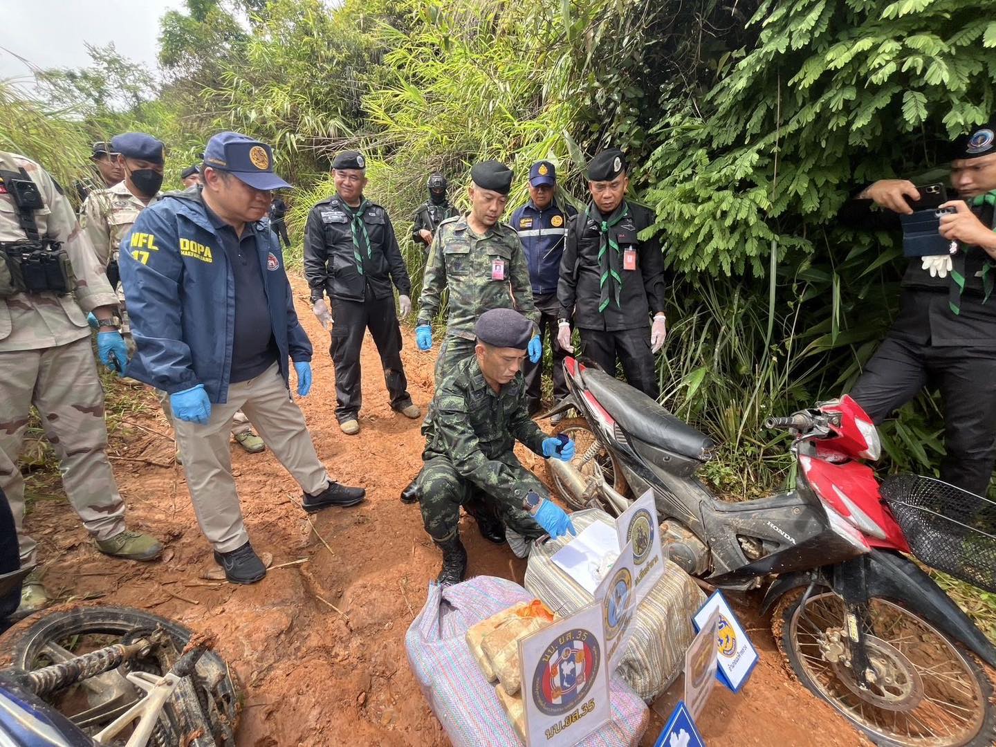 จากกรณี เมื่อวันที่ 22 มิถุนายน 2568 เวลา 18.30 นาฬิกา กองร้อยทหารพรานที่ 3109 หน่วยเฉพาะกิจกรมทหารพรานที่ 31 จัดกำลัง จำนวน 1 ชุดปฏิบัติการ ทำการลาดตระเวนเฝ้าตรวจเพื่อป้องกันและสกัดกั้นการกระทำผิดตามพระราชบัญญัติยาเสพติด บริเวณ บ้านเจียงจาใส หมู่ที่11 ตำบลแม่สลองนอก อำเภอแม่ฟ้าหลวง จังหวัดเชียงราย ต่อมาเมื่อวันที่ 23 มิถุนายน 2568 เวลา 05.30 นาฬิกา ตรวจพบแสงไฟรถจักรยานยนต์ขับตามกันมา จำนวน 5 คัน ลงมาจากเส้นทาง บ้านสามสูง ตำบลแม่สลองใน อำเภอแม่ฟ้าหลวง จังหวัดเชียงราย หน่วยจึงได้ทำการตั้งจุดสกัด บริเวณ บ้านเจียงจาใส หมู่ที่11 ตำบลแม่สลองนอก อำเภอแม่ฟ้าหลวง จังหวัดเชียงราย พบจักรยานยนต์เข้ามาบริเวณดังกล่าว กลุ่มบุคคลดังกล่าวเมื่อเห็นเจ้าหน้าที่ ได้ทิ้งรถจักรยานยนต์ และอาศัยความมืดหลบหนีไป บางส่วนได้กลับรถหลบหนีไป จากการตรวจสอบบริเวณดังกล่าว ตรวจพบกระสอบฟาง จำนวน 2 กระสอบ ภายในบรรจุยาเสพติดให้โทษประเภท 1 (ยาบ้า) จำนวน 200,000 เม็ด 1 กระสอบ และ จำนวน 202,000 เม็ด 1 กระสอบ รวมประมาณ 402,000 เม็ด และรถจักรยานยนต์ ไม่ติดแผ่นป้ายทะเบียน จำนวน 2 คัน ปัจจุบันหน่วยได้จัดกำลังเพิ่มเติม จำนวน 1 ชป. เพื่อทำการตรวจสอบพื้นที่บริเวณโดยรอบ จากการตรวจสอบไม่พบยาเสพติดเพิ่มเติม