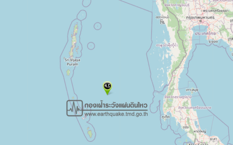 แผ่นดินไหวขนาด 4.3 บริเวณหมู่เกาะนิโคบาร์ ประเทศอินเดีย ศูนย์กลางห่าง อ.เมือง จ.พังงา ประมาณ 413 กม.