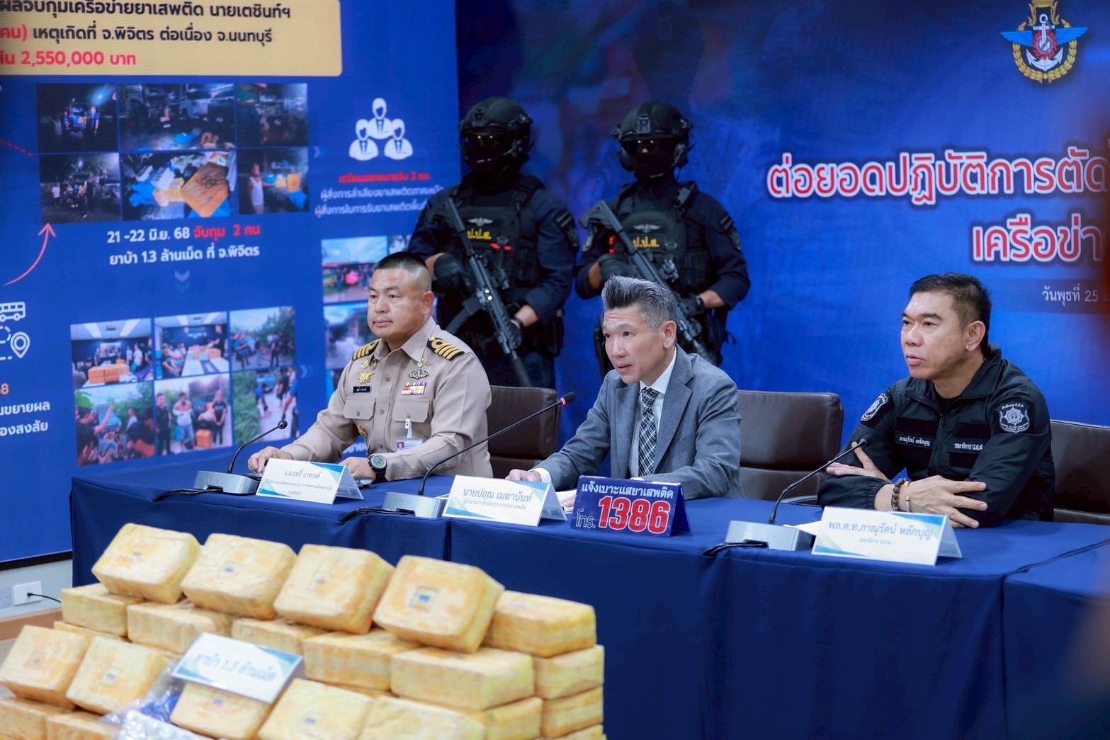 วันพุธที่ 25 มิถุนายน 2568 พลตำรวจโท ภาณุรัตน์ หลักบุญ เลขาธิการ ป.ป.ส. พร้อมด้วยนายปฤณ เมฆานันท์ ผู้อำนวยการสำนักปราบปรามยาเสพติด สำนักงาน ป.ป.ส., น.อ.ฤทธิ์ นาทวงศ์ ผู้บังคับกรมรบพิเศษ หน่วยบัญชาการสงครามพิเศษทางเรือ และ พ.อ.พิรุฬห์สิระ เอี่ยมมาลา ผู้บังคับหน่วยข่าวกรองทางทหาร สนับสนุนหน่วยบัญชาการสงครามพิเศษ แถลงผลการจับกุม ผู้ต้องหา 4 คน ยาบ้า 1,300,000 เม็ด เหตุเกิดที่ จ.พิจิตร ต่อเนื่อง จ.นนทบุรี ขยายผลตรวจค้นบ้านพักผู้ต้องหารวม 4 จุด (จ.พะเยา, จ.ระยอง) ผลการตรวจค้น พบ ยาบ้า 39 เม็ด ตรวจยึดอายัดทรัพย์สิน อาทิเช่น ที่ดินพร้อมสิ่งปลูกสร้าง 2 แปลง รถยนต์ 1 คันรวมมูลค่าประมาณ 2,550,000 บาท